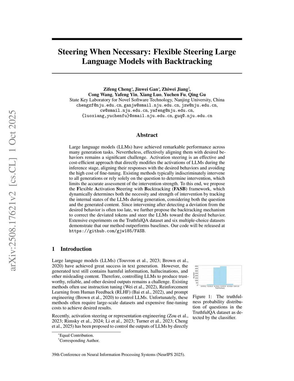 Large language models (LLMs) have achieved remarkable performance across many generation tasks. Nevertheless, effectively aligning them with desired behaviors remains a significant challenge. Activation steering is an effective and cost-efficient approach that directly modifies the activations of LLMs during the inference stage, aligning their responses with the desired behaviors and avoiding the high cost of fine-tuning. Existing methods typically indiscriminately intervene to all generations or rely solely on the question to determine intervention, which limits the accurate assessment of the intervention strength. To this end, we propose the Flexible Activation Steering with Backtracking (FASB) framework, which dynamically determines both the necessity and strength of intervention by tracking the internal states of the LLMs during generation, considering both the question and the generated content. Since intervening after detecting a deviation from the desired behavior is often too late, we further propose the backtracking mechanism to correct the deviated tokens and steer the LLMs toward the desired behavior. Extensive experiments on the TruthfulQA dataset and six multiple-choice datasets demonstrate that our method outperforms baselines. Our code will be released at this https URL.