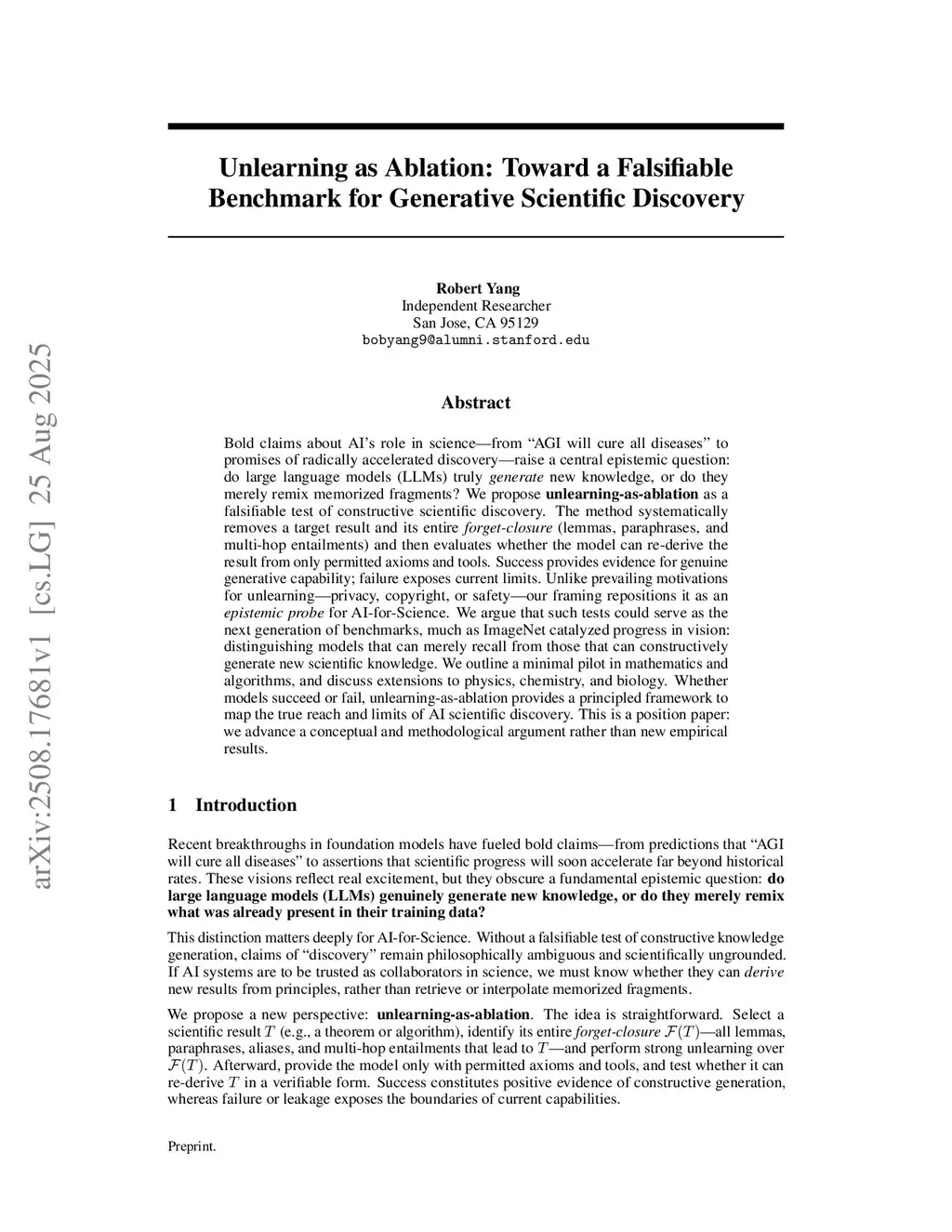Bold claims about AI's role in science-from "AGI will cure all diseases" to promises of radically accelerated discovery-raise a central epistemic question: do large language models (LLMs) truly generate new knowledge, or do they merely remix memorized fragments? We propose unlearning-as-ablation as a falsifiable probe of constructive scientific discovery. The idea is to systematically remove a target result together with its forget-closure (supporting lemmas, paraphrases, and multi-hop entailments) and then evaluate whether the model can re-derive the result from only permitted axioms and tools. Success would indicate generative capability beyond recall; failure would expose current limits. Unlike prevailing motivations for unlearning-privacy, copyright, or safety-our framing repositions it as an epistemic probe for AI-for-Science. We outline a minimal pilot in mathematics and algorithms to illustrate feasibility, and sketch how the same approach could later be extended to domains such as physics or chemistry. This is a position paper: our contribution is conceptual and methodological, not empirical. We aim to stimulate discussion on how principled ablation tests could help distinguish models that reconstruct knowledge from those that merely retrieve it, and how such probes might guide the next generation of AI-for-Science benchmarks.