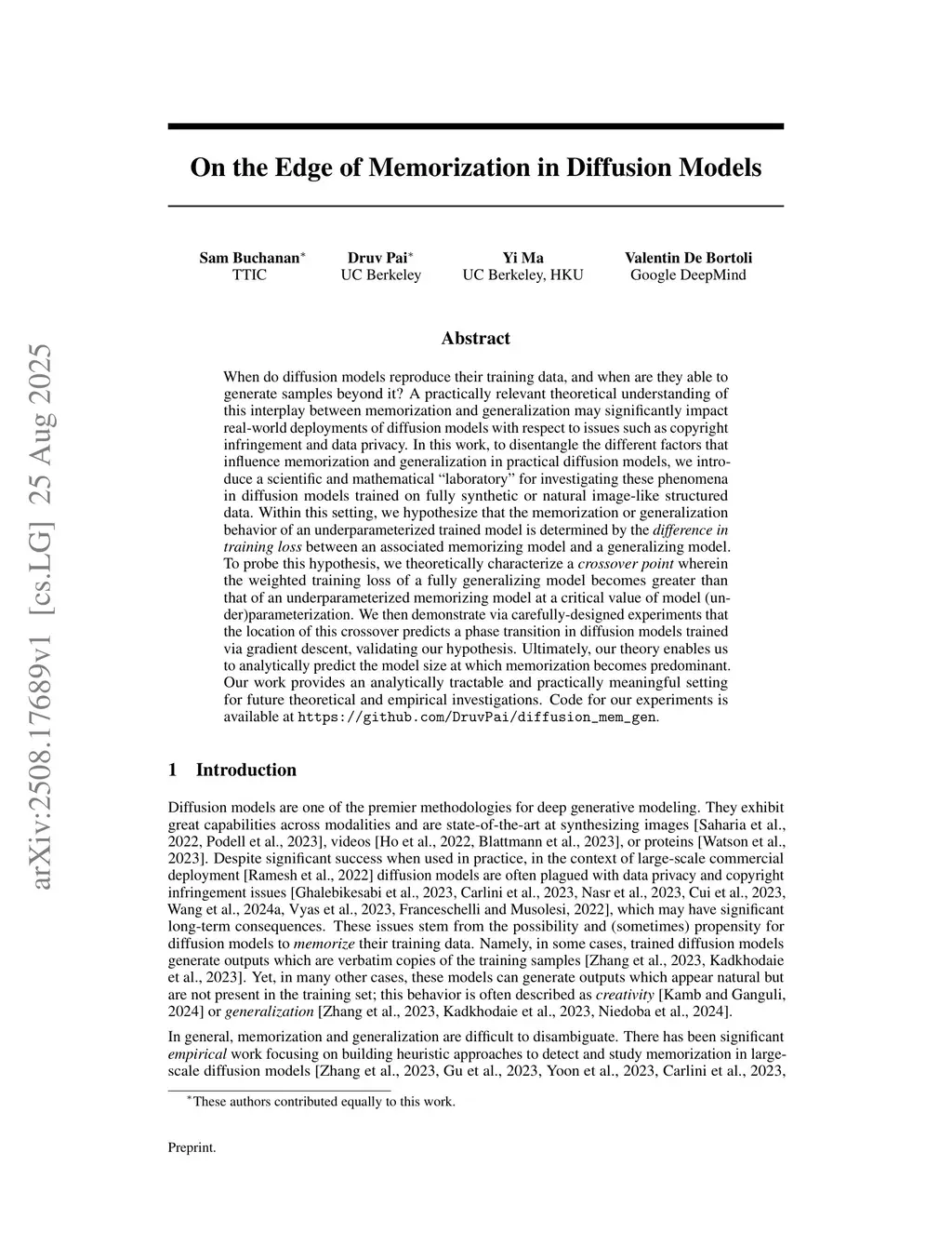 When do diffusion models reproduce their training data, and when are they able to generate samples beyond it? A practically relevant theoretical understanding of this interplay between memorization and generalization may significantly impact real-world deployments of diffusion models with respect to issues such as copyright infringement and data privacy. In this work, to disentangle the different factors that influence memorization and generalization in practical diffusion models, we introduce a scientific and mathematical "laboratory" for investigating these phenomena in diffusion models trained on fully synthetic or natural image-like structured data. Within this setting, we hypothesize that the memorization or generalization behavior of an underparameterized trained model is determined by the difference in training loss between an associated memorizing model and a generalizing model. To probe this hypothesis, we theoretically characterize a crossover point wherein the weighted training loss of a fully generalizing model becomes greater than that of an underparameterized memorizing model at a critical value of model (under)parameterization. We then demonstrate via carefully-designed experiments that the location of this crossover predicts a phase transition in diffusion models trained via gradient descent, validating our hypothesis. Ultimately, our theory enables us to analytically predict the model size at which memorization becomes predominant. Our work provides an analytically tractable and practically meaningful setting for future theoretical and empirical investigations. Code for our experiments is available atthis https URL.