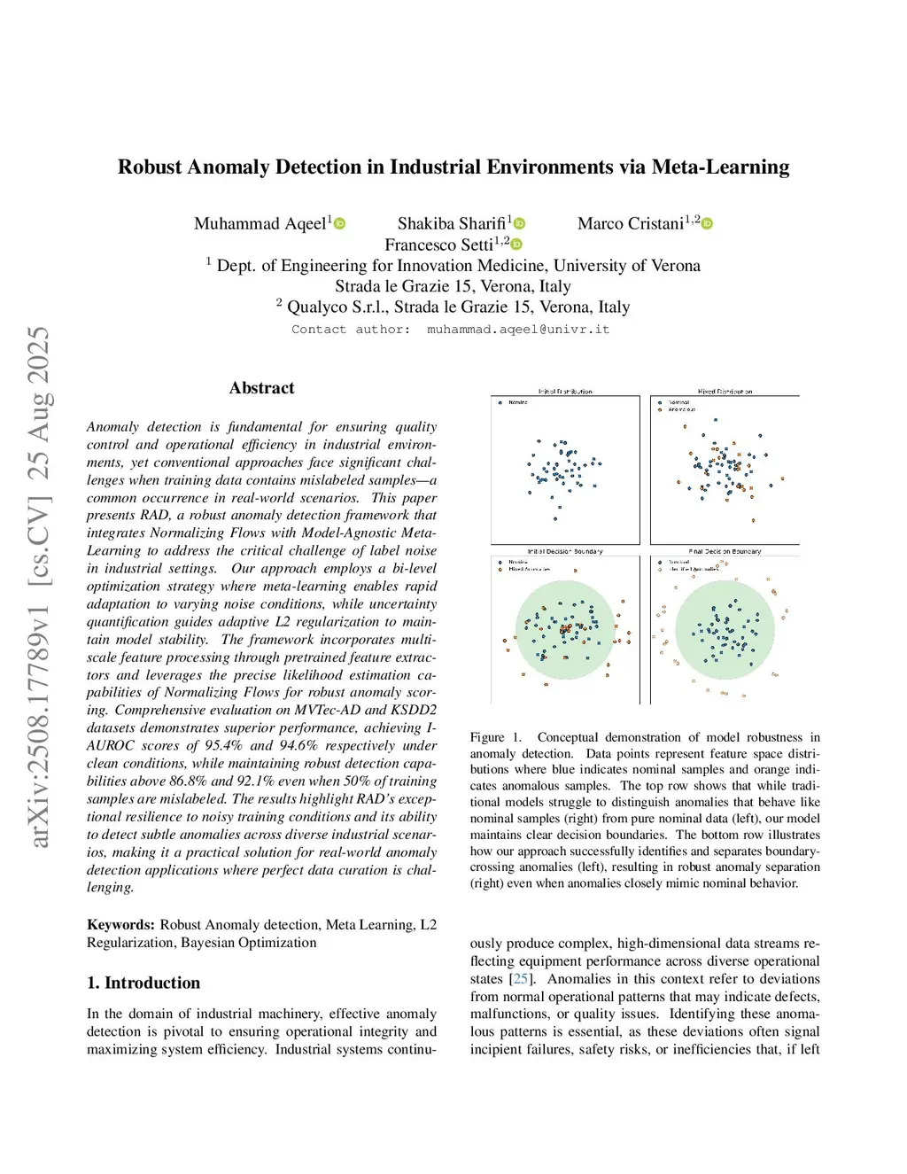 Anomaly detection is fundamental for ensuring quality control and operational efficiency in industrial environments, yet conventional approaches face significant challenges when training data contains mislabeled samples-a common occurrence in real-world scenarios. This paper presents RAD, a robust anomaly detection framework that integrates Normalizing Flows with Model-Agnostic Meta-Learning to address the critical challenge of label noise in industrial settings. Our approach employs a bi-level optimization strategy where meta-learning enables rapid adaptation to varying noise conditions, while uncertainty quantification guides adaptive L2 regularization to maintain model stability. The framework incorporates multiscale feature processing through pretrained feature extractors and leverages the precise likelihood estimation capabilities of Normalizing Flows for robust anomaly scoring. Comprehensive evaluation on MVTec-AD and KSDD2 datasets demonstrates superior performance, achieving I-AUROC scores of 95.4% and 94.6% respectively under clean conditions, while maintaining robust detection capabilities above 86.8% and 92.1% even when 50% of training samples are mislabeled. The results highlight RAD's exceptional resilience to noisy training conditions and its ability to detect subtle anomalies across diverse industrial scenarios, making it a practical solution for real-world anomaly detection applications where perfect data curation is challenging.