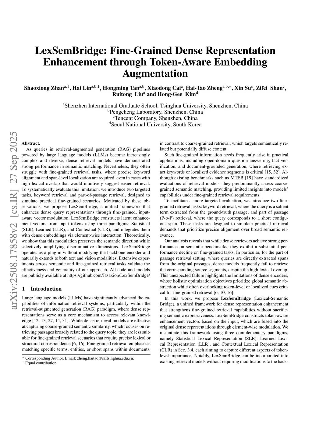 As queries in retrieval-augmented generation (RAG) pipelines powered by large language models (LLMs) become increasingly complex and diverse, dense retrieval models have demonstrated strong performance in semantic matching. Nevertheless, they often struggle with fine-grained retrieval tasks, where precise keyword alignment and span-level localization are required, even in cases with high lexical overlap that would intuitively suggest easier retrieval. To systematically evaluate this limitation, we introduce two targeted tasks, keyword retrieval and part-of-passage retrieval, designed to simulate practical fine-grained scenarios. Motivated by these observations, we propose LexSemBridge, a unified framework that enhances dense query representations through fine-grained, input-aware vector modulation. LexSemBridge constructs latent enhancement vectors from input tokens using three paradigms: Statistical (SLR), Learned (LLR), and Contextual (CLR), and integrates them with dense embeddings via element-wise interaction. Theoretically, we show that this modulation preserves the semantic direction while selectively amplifying discriminative dimensions. LexSemBridge operates as a plug-in without modifying the backbone encoder and naturally extends to both text and vision modalities. Extensive experiments across semantic and fine-grained retrieval tasks validate the effectiveness and generality of our approach. All code and models are publicly available atthis https URL