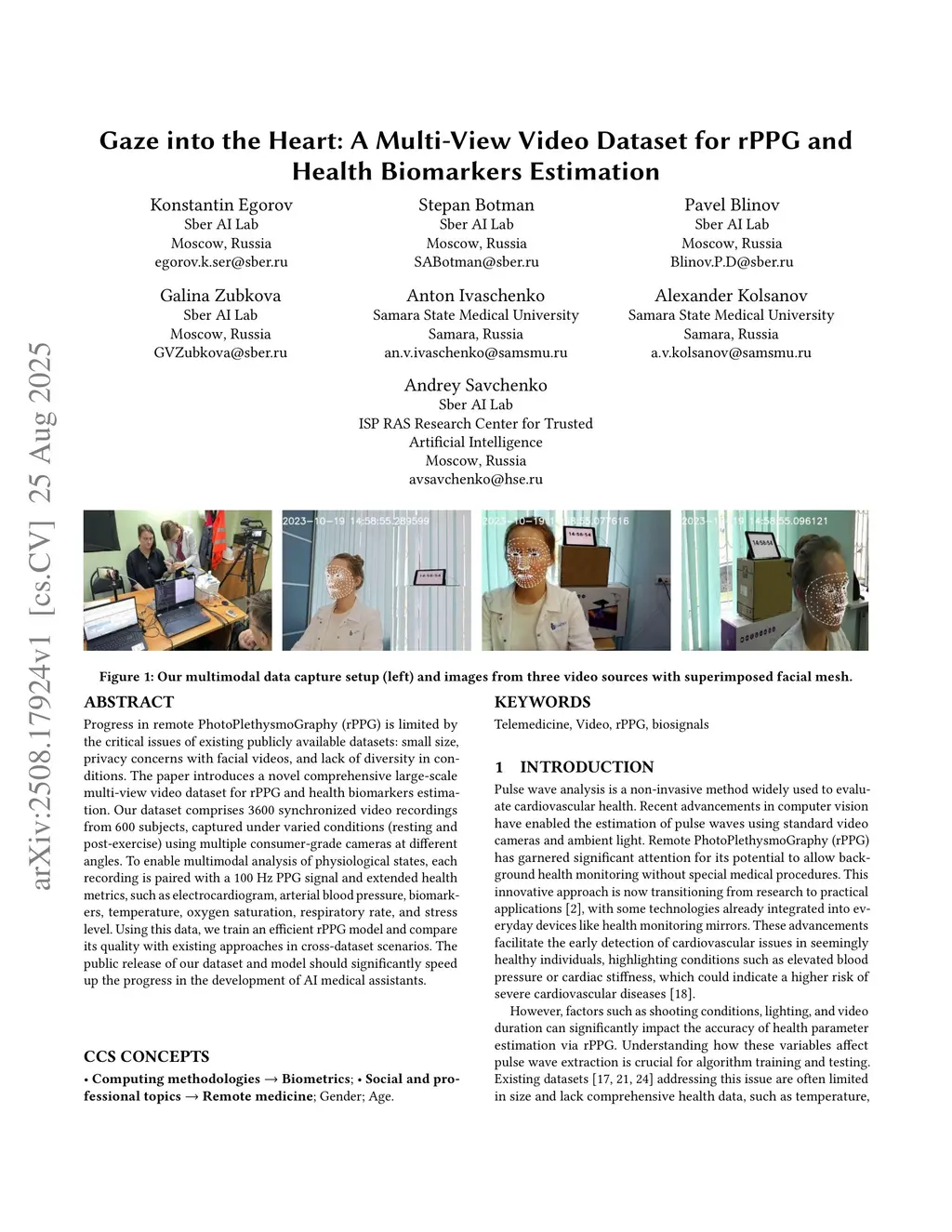 Progress in remote PhotoPlethysmoGraphy (rPPG) is limited by the critical issues of existing publicly available datasets: small size, privacy concerns with facial videos, and lack of diversity in conditions. The paper introduces a novel comprehensive large-scale multi-view video dataset for rPPG and health biomarkers estimation. Our dataset comprises 3600 synchronized video recordings from 600 subjects, captured under varied conditions (resting and post-exercise) using multiple consumer-grade cameras at different angles. To enable multimodal analysis of physiological states, each recording is paired with a 100 Hz PPG signal and extended health metrics, such as electrocardiogram, arterial blood pressure, biomarkers, temperature, oxygen saturation, respiratory rate, and stress level. Using this data, we train an efficient rPPG model and compare its quality with existing approaches in cross-dataset scenarios. The public release of our dataset and model should significantly speed up the progress in the development of AI medical assistants.