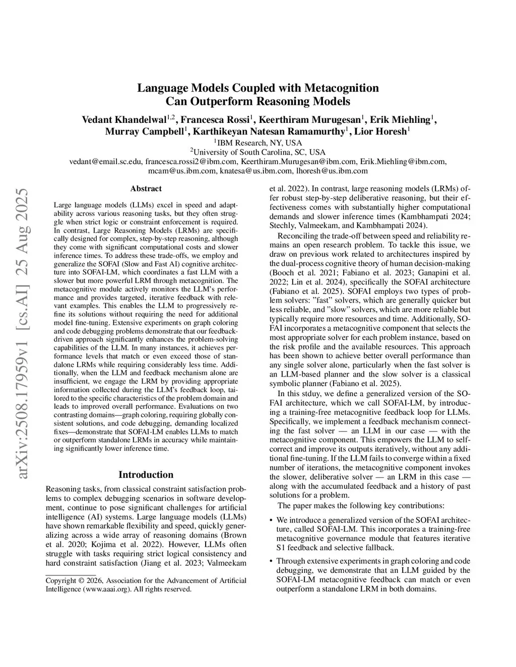 Large language models (LLMs) excel in speed and adaptability across various reasoning tasks, but they often struggle when strict logic or constraint enforcement is required. In contrast, Large Reasoning Models (LRMs) are specifically designed for complex, step-by-step reasoning, although they come with significant computational costs and slower inference times. To address these trade-offs, we employ and generalize the SOFAI (Slow and Fast AI) cognitive architecture into SOFAI-LM, which coordinates a fast LLM with a slower but more powerful LRM through metacognition. The metacognitive module actively monitors the LLM's performance and provides targeted, iterative feedback with relevant examples. This enables the LLM to progressively refine its solutions without requiring the need for additional model fine-tuning. Extensive experiments on graph coloring and code debugging problems demonstrate that our feedback-driven approach significantly enhances the problem-solving capabilities of the LLM. In many instances, it achieves performance levels that match or even exceed those of standalone LRMs while requiring considerably less time. Additionally, when the LLM and feedback mechanism alone are insufficient, we engage the LRM by providing appropriate information collected during the LLM's feedback loop, tailored to the specific characteristics of the problem domain and leads to improved overall performance. Evaluations on two contrasting domains: graph coloring, requiring globally consistent solutions, and code debugging, demanding localized fixes, demonstrate that SOFAI-LM enables LLMs to match or outperform standalone LRMs in accuracy while maintaining significantly lower inference time.