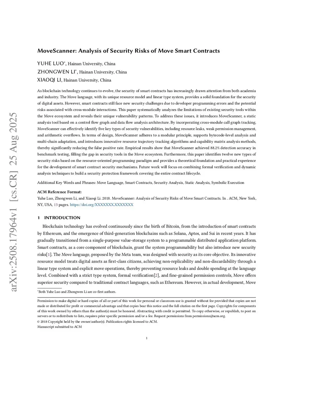 MoveScanner: Analysis of Security Risks of Move Smart Contracts