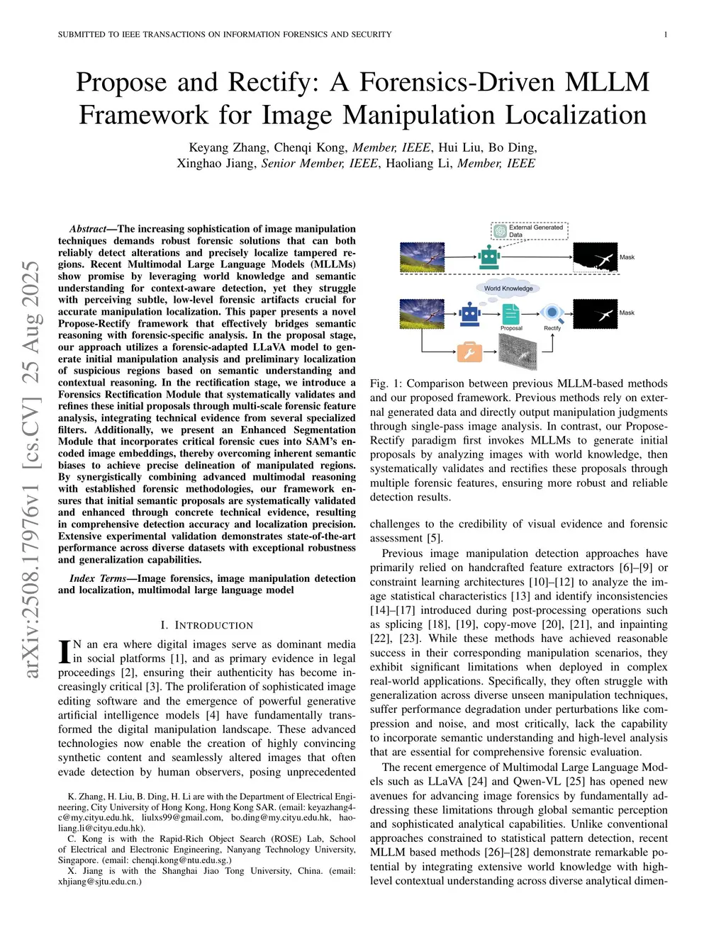 The increasing sophistication of image manipulation techniques demands robust forensic solutions that can both reliably detect alterations and precisely localize tampered regions. Recent Multimodal Large Language Models (MLLMs) show promise by leveraging world knowledge and semantic understanding for context-aware detection, yet they struggle with perceiving subtle, low-level forensic artifacts crucial for accurate manipulation localization. This paper presents a novel Propose-Rectify framework that effectively bridges semantic reasoning with forensic-specific analysis. In the proposal stage, our approach utilizes a forensic-adapted LLaVA model to generate initial manipulation analysis and preliminary localization of suspicious regions based on semantic understanding and contextual reasoning. In the rectification stage, we introduce a Forensics Rectification Module that systematically validates and refines these initial proposals through multi-scale forensic feature analysis, integrating technical evidence from several specialized filters. Additionally, we present an Enhanced Segmentation Module that incorporates critical forensic cues into SAM's encoded image embeddings, thereby overcoming inherent semantic biases to achieve precise delineation of manipulated regions. By synergistically combining advanced multimodal reasoning with established forensic methodologies, our framework ensures that initial semantic proposals are systematically validated and enhanced through concrete technical evidence, resulting in comprehensive detection accuracy and localization precision. Extensive experimental validation demonstrates state-of-the-art performance across diverse datasets with exceptional robustness and generalization capabilities.