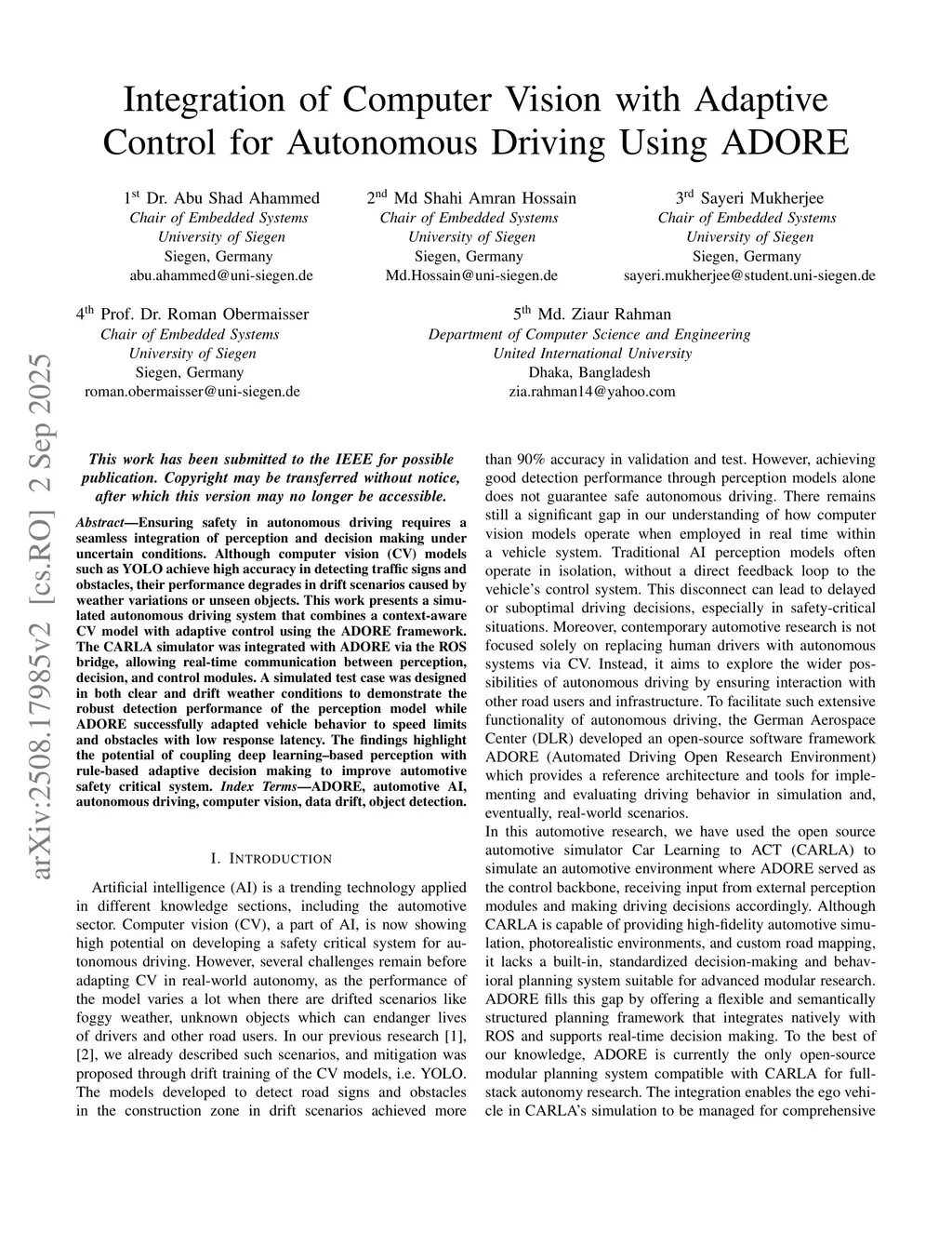 Integration of Computer Vision with Adaptive Control for Autonomous Driving Using ADORE