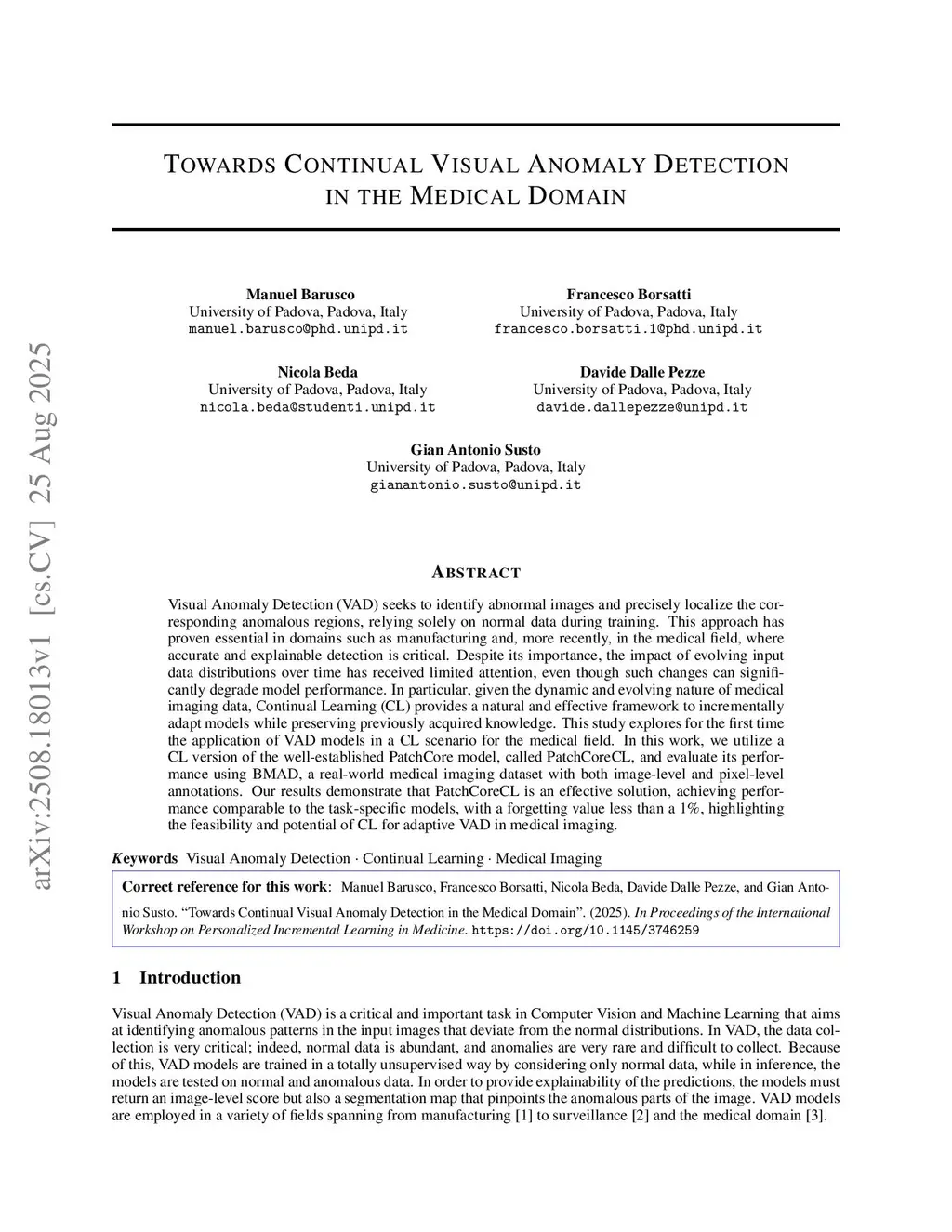 Visual Anomaly Detection (VAD) seeks to identify abnormal images and precisely localize the corresponding anomalous regions, relying solely on normal data during training. This approach has proven essential in domains such as manufacturing and, more recently, in the medical field, where accurate and explainable detection is critical. Despite its importance, the impact of evolving input data distributions over time has received limited attention, even though such changes can significantly degrade model performance. In particular, given the dynamic and evolving nature of medical imaging data, Continual Learning (CL) provides a natural and effective framework to incrementally adapt models while preserving previously acquired knowledge. This study explores for the first time the application of VAD models in a CL scenario for the medical field. In this work, we utilize a CL version of the well-established PatchCore model, called PatchCoreCL, and evaluate its performance using BMAD, a real-world medical imaging dataset with both image-level and pixel-level annotations. Our results demonstrate that PatchCoreCL is an effective solution, achieving performance comparable to the task-specific models, with a forgetting value less than a 1%, highlighting the feasibility and potential of CL for adaptive VAD in medical imaging.