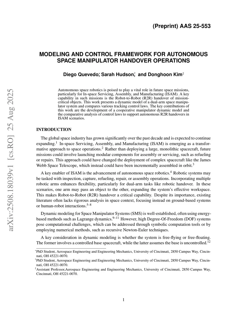 Modeling and Control Framework for Autonomous Space Manipulator Handover Operations