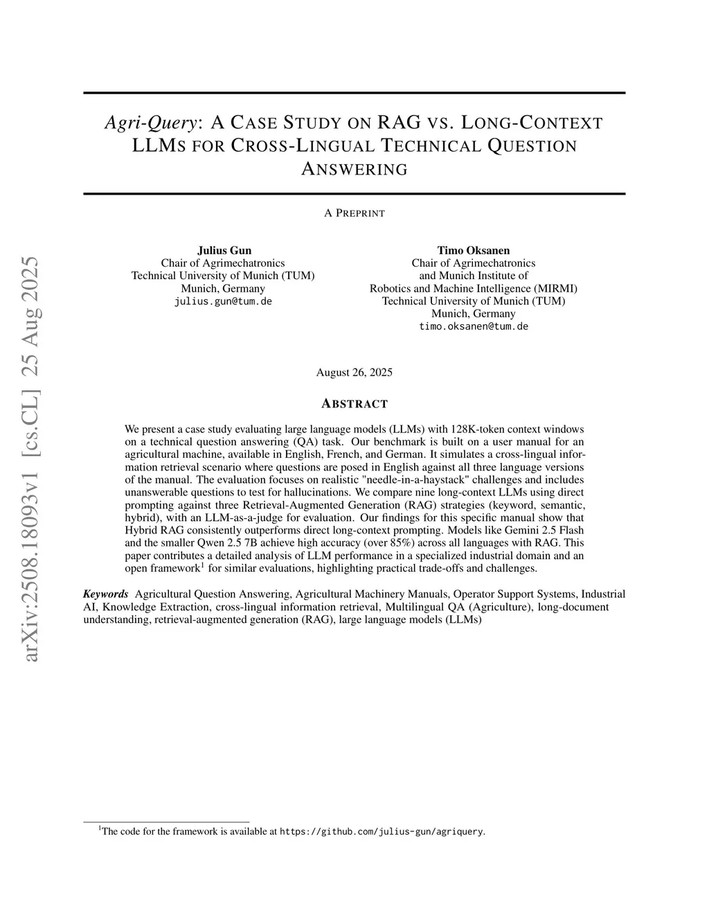We present a case study evaluating large language models (LLMs) with 128K-token context windows on a technical question answering (QA) task. Our benchmark is built on a user manual for an agricultural machine, available in English, French, and German. It simulates a cross-lingual information retrieval scenario where questions are posed in English against all three language versions of the manual. The evaluation focuses on realistic "needle-in-a-haystack" challenges and includes unanswerable questions to test for hallucinations. We compare nine long-context LLMs using direct prompting against three Retrieval-Augmented Generation (RAG) strategies (keyword, semantic, hybrid), with an LLM-as-a-judge for evaluation. Our findings for this specific manual show that Hybrid RAG consistently outperforms direct long-context prompting. Models like Gemini 2.5 Flash and the smaller Qwen 2.5 7B achieve high accuracy (over 85%) across all languages with RAG. This paper contributes a detailed analysis of LLM performance in a specialized industrial domain and an open framework for similar evaluations, highlighting practical trade-offs and challenges.