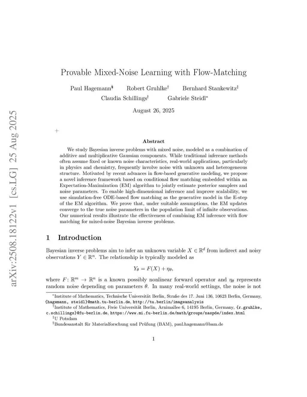 We study Bayesian inverse problems with mixed noise, modeled as a combination of additive and multiplicative Gaussian components. While traditional inference methods often assume fixed or known noise characteristics, real-world applications, particularly in physics and chemistry, frequently involve noise with unknown and heterogeneous structure. Motivated by recent advances in flow-based generative modeling, we propose a novel inference framework based on conditional flow matching embedded within an Expectation-Maximization (EM) algorithm to jointly estimate posterior samplers and noise parameters. To enable high-dimensional inference and improve scalability, we use simulation-free ODE-based flow matching as the generative model in the E-step of the EM algorithm. We prove that, under suitable assumptions, the EM updates converge to the true noise parameters in the population limit of infinite observations. Our numerical results illustrate the effectiveness of combining EM inference with flow matching for mixed-noise Bayesian inverse problems.