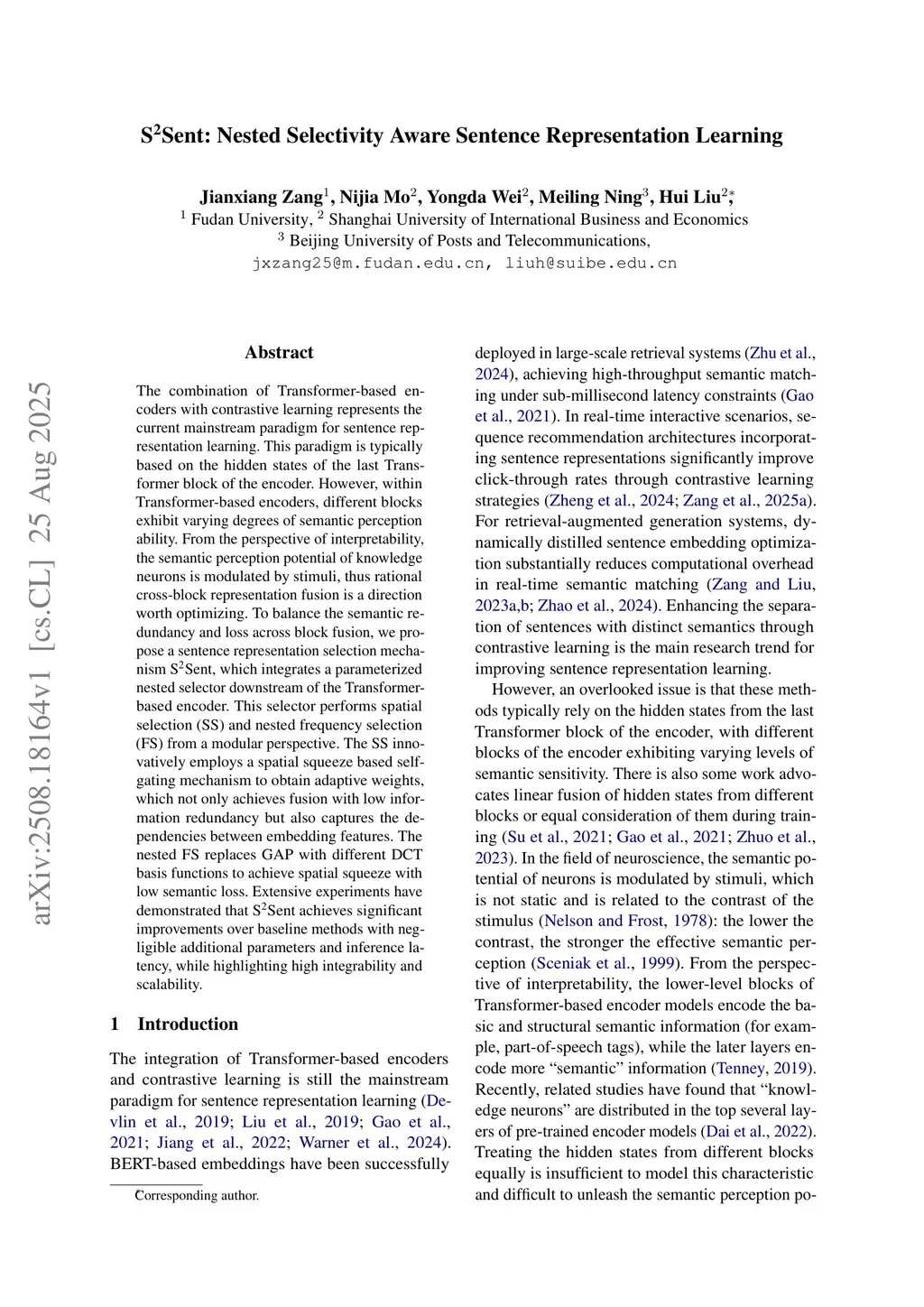 The combination of Transformer-based encoders with contrastive learning represents the current mainstream paradigm for sentence representation learning. This paradigm is typically based on the hidden states of the last Transformer block of the encoder. However, within Transformer-based encoders, different blocks exhibit varying degrees of semantic perception ability. From the perspective of interpretability, the semantic perception potential of knowledge neurons is modulated by stimuli, thus rational cross-block representation fusion is a direction worth optimizing. To balance the semantic redundancy and loss across block fusion, we propose a sentence representation selection mechanism S\textsuperscript{2}Sent, which integrates a parameterized nested selector downstream of the Transformer-based encoder. This selector performs spatial selection (SS) and nested frequency selection (FS) from a modular perspective. The SS innovatively employs a spatial squeeze based self-gating mechanism to obtain adaptive weights, which not only achieves fusion with low information redundancy but also captures the dependencies between embedding features. The nested FS replaces GAP with different DCT basis functions to achieve spatial squeeze with low semantic loss. Extensive experiments have demonstrated that S\textsuperscript{2}Sent achieves significant improvements over baseline methods with negligible additional parameters and inference latency, while highlighting high integrability and scalability.