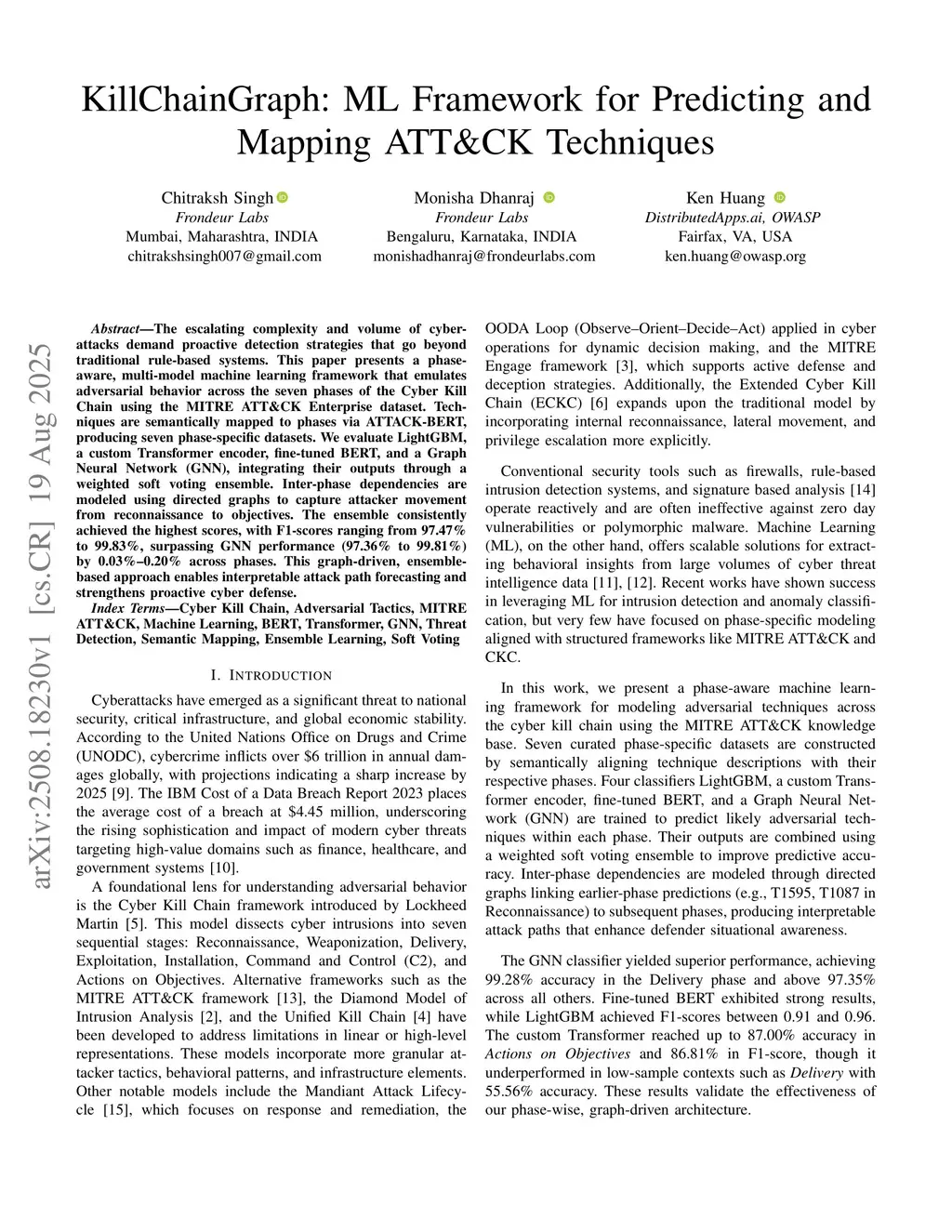 The escalating complexity and volume of cyberattacks demand proactive detection strategies that go beyond traditional rule-based systems. This paper presents a phase-aware, multi-model machine learning framework that emulates adversarial behavior across the seven phases of the Cyber Kill Chain using the MITRE ATT&CK Enterprise dataset. Techniques are semantically mapped to phases via ATTACK-BERT, producing seven phase-specific datasets. We evaluate LightGBM, a custom Transformer encoder, fine-tuned BERT, and a Graph Neural Network (GNN), integrating their outputs through a weighted soft voting ensemble. Inter-phase dependencies are modeled using directed graphs to capture attacker movement from reconnaissance to objectives. The ensemble consistently achieved the highest scores, with F1-scores ranging from 97.47% to 99.83%, surpassing GNN performance (97.36% to 99.81%) by 0.03%--0.20% across phases. This graph-driven, ensemble-based approach enables interpretable attack path forecasting and strengthens proactive cyber defense.