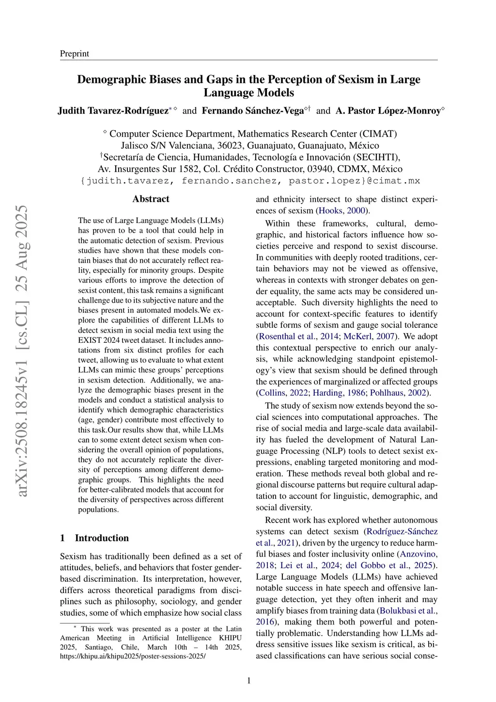 The use of Large Language Models (LLMs) has proven to be a tool that could help in the automatic detection of sexism. Previous studies have shown that these models contain biases that do not accurately reflect reality, especially for minority groups. Despite various efforts to improve the detection of sexist content, this task remains a significant challenge due to its subjective nature and the biases present in automated models. We explore the capabilities of different LLMs to detect sexism in social media text using the EXIST 2024 tweet dataset. It includes annotations from six distinct profiles for each tweet, allowing us to evaluate to what extent LLMs can mimic these groups' perceptions in sexism detection. Additionally, we analyze the demographic biases present in the models and conduct a statistical analysis to identify which demographic characteristics (age, gender) contribute most effectively to this task. Our results show that, while LLMs can to some extent detect sexism when considering the overall opinion of populations, they do not accurately replicate the diversity of perceptions among different demographic groups. This highlights the need for better-calibrated models that account for the diversity of perspectives across different populations.