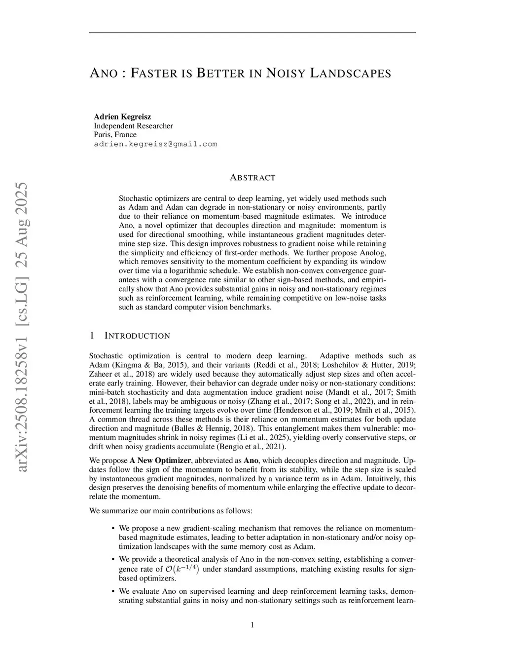 Stochastic optimizers are central to deep learning, yet widely used methods such as Adam and Adan can degrade in non-stationary or noisy environments, partly due to their reliance on momentum-based magnitude estimates. We introduce Ano, a novel optimizer that decouples direction and magnitude: momentum is used for directional smoothing, while instantaneous gradient magnitudes determine step size. This design improves robustness to gradient noise while retaining the simplicity and efficiency of first-order methods. We further propose Anolog, which removes sensitivity to the momentum coefficient by expanding its window over time via a logarithmic schedule. We establish non-convex convergence guarantees with a convergence rate similar to other sign-based methods, and empirically show that Ano provides substantial gains in noisy and non-stationary regimes such as reinforcement learning, while remaining competitive on low-noise tasks such as standard computer vision benchmarks.
