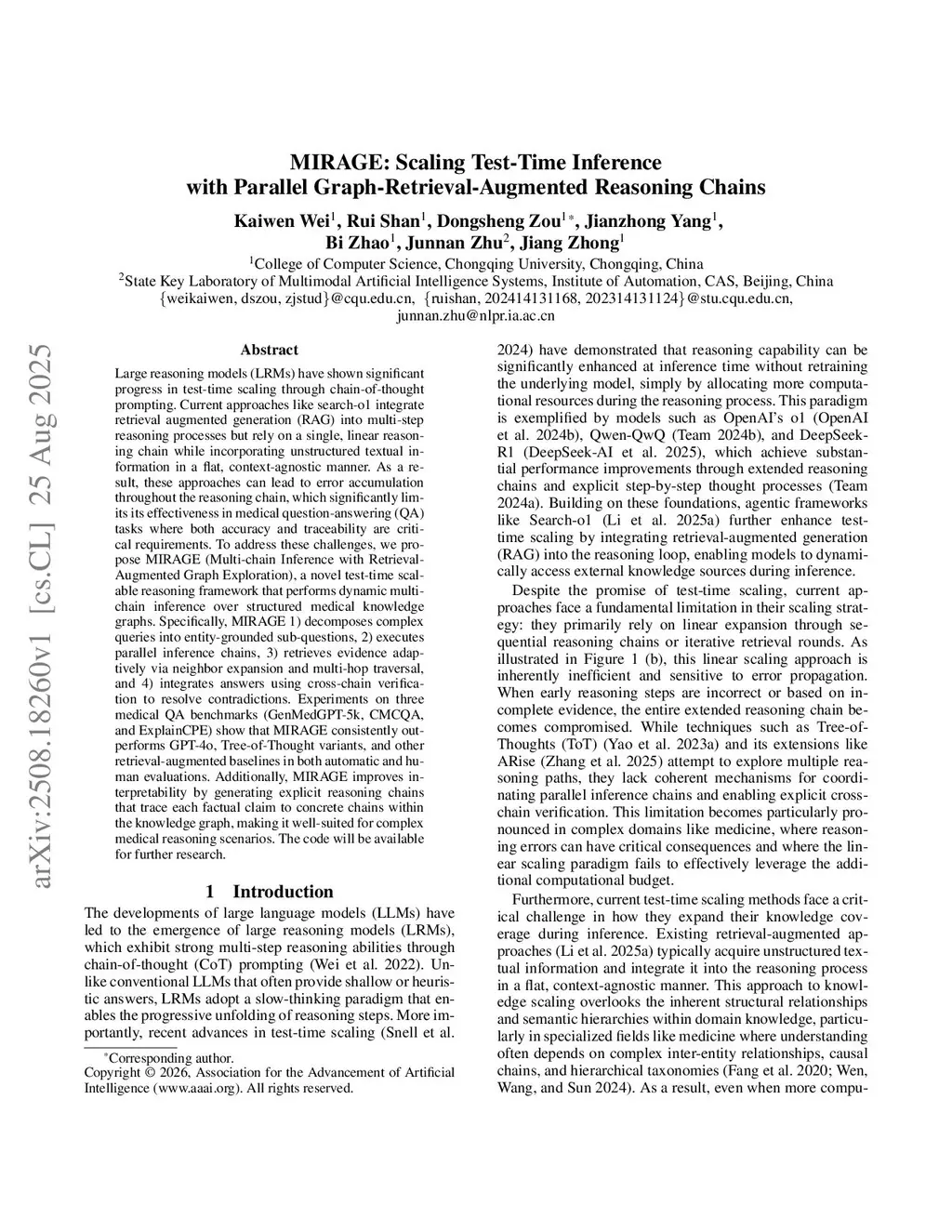 Large reasoning models (LRMs) have shown significant progress in test-time scaling through chain-of-thought prompting. Current approaches like search-o1 integrate retrieval augmented generation (RAG) into multi-step reasoning processes but rely on a single, linear reasoning chain while incorporating unstructured textual information in a flat, context-agnostic manner. As a result, these approaches can lead to error accumulation throughout the reasoning chain, which significantly limits its effectiveness in medical question-answering (QA) tasks where both accuracy and traceability are critical requirements. To address these challenges, we propose MIRAGE (Multi-chain Inference with Retrieval-Augmented Graph Exploration), a novel test-time scalable reasoning framework that performs dynamic multi-chain inference over structured medical knowledge graphs. Specifically, MIRAGE 1) decomposes complex queries into entity-grounded sub-questions, 2) executes parallel inference chains, 3) retrieves evidence adaptively via neighbor expansion and multi-hop traversal, and 4) integrates answers using cross-chain verification to resolve contradictions. Experiments on three medical QA benchmarks (GenMedGPT-5k, CMCQA, and ExplainCPE) show that MIRAGE consistently outperforms GPT-4o, Tree-of-Thought variants, and other retrieval-augmented baselines in both automatic and human evaluations. Additionally, MIRAGE improves interpretability by generating explicit reasoning chains that trace each factual claim to concrete chains within the knowledge graph, making it well-suited for complex medical reasoning scenarios. The code will be available for further research.