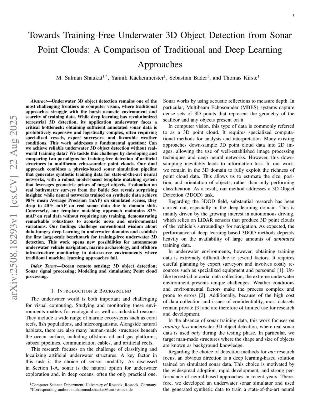 Underwater 3D object detection remains one of the most challenging frontiers in computer vision, where traditional approaches struggle with the harsh acoustic environment and scarcity of training data. While deep learning has revolutionized terrestrial 3D detection, its application underwater faces a critical bottleneck: obtaining sufficient annotated sonar data is prohibitively expensive and logistically complex, often requiring specialized vessels, expert surveyors, and favorable weather conditions. This work addresses a fundamental question: Can we achieve reliable underwater 3D object detection without real-world training data? We tackle this challenge by developing and comparing two paradigms for training-free detection of artificial structures in multibeam echo-sounder point clouds. Our dual approach combines a physics-based sonar simulation pipeline that generates synthetic training data for state-of-the-art neural networks, with a robust model-based template matching system that leverages geometric priors of target objects. Evaluation on real bathymetry surveys from the Baltic Sea reveals surprising insights: while neural networks trained on synthetic data achieve 98% mean Average Precision (mAP) on simulated scenes, they drop to 40% mAP on real sonar data due to domain shift. Conversely, our template matching approach maintains 83% mAP on real data without requiring any training, demonstrating remarkable robustness to acoustic noise and environmental variations. Our findings challenge conventional wisdom about data-hungry deep learning in underwater domains and establish the first large-scale benchmark for training-free underwater 3D detection. This work opens new possibilities for autonomous underwater vehicle navigation, marine archaeology, and offshore infrastructure monitoring in data-scarce environments where traditional machine learning approaches fail.