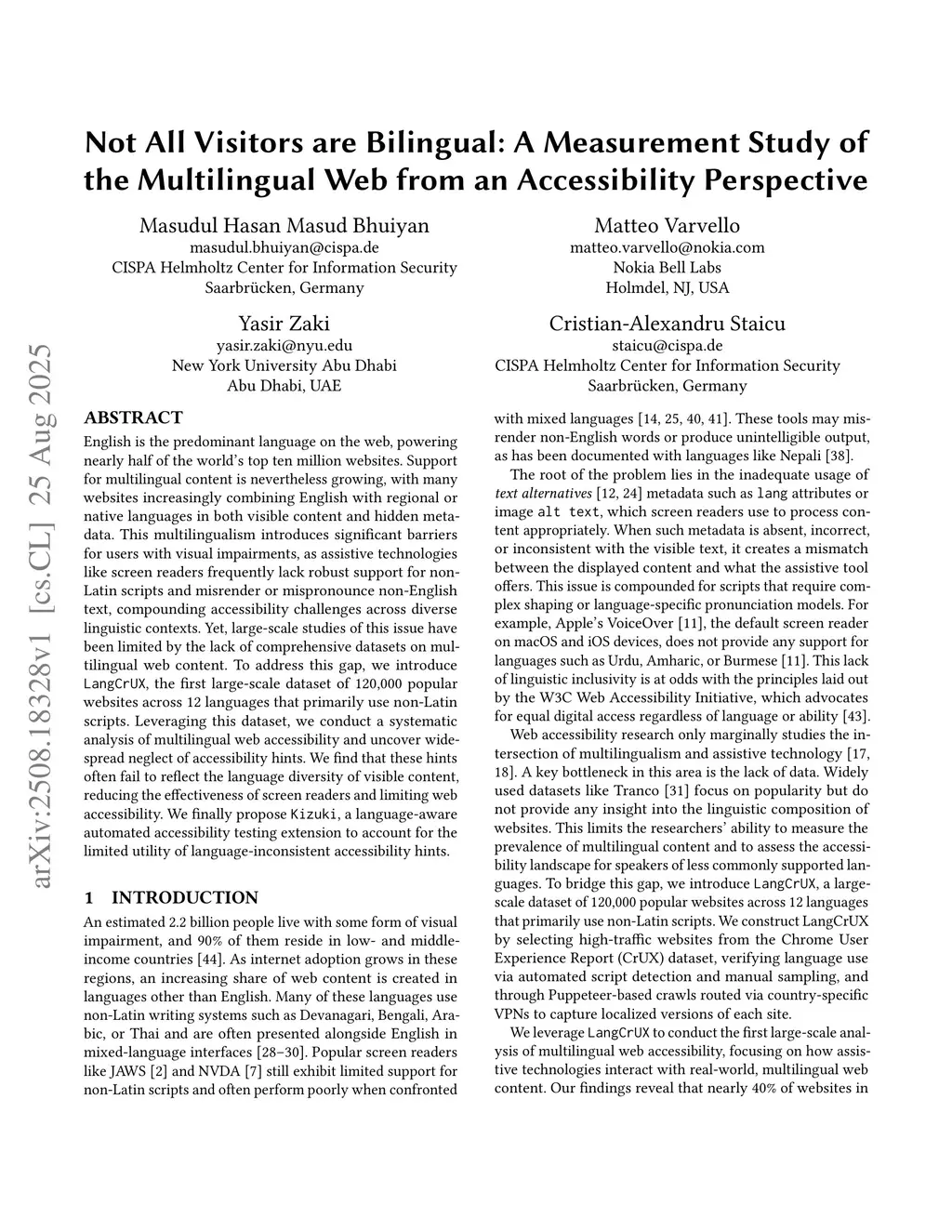English is the predominant language on the web, powering nearly half of the world's top ten million websites. Support for multilingual content is nevertheless growing, with many websites increasingly combining English with regional or native languages in both visible content and hidden metadata. This multilingualism introduces significant barriers for users with visual impairments, as assistive technologies like screen readers frequently lack robust support for non-Latin scripts and misrender or mispronounce non-English text, compounding accessibility challenges across diverse linguistic contexts. Yet, large-scale studies of this issue have been limited by the lack of comprehensive datasets on multilingual web content. To address this gap, we introduce LangCrUX, the first large-scale dataset of 120,000 popular websites across 12 languages that primarily use non-Latin scripts. Leveraging this dataset, we conduct a systematic analysis of multilingual web accessibility and uncover widespread neglect of accessibility hints. We find that these hints often fail to reflect the language diversity of visible content, reducing the effectiveness of screen readers and limiting web accessibility. We finally propose Kizuki, a language-aware automated accessibility testing extension to account for the limited utility of language-inconsistent accessibility hints.