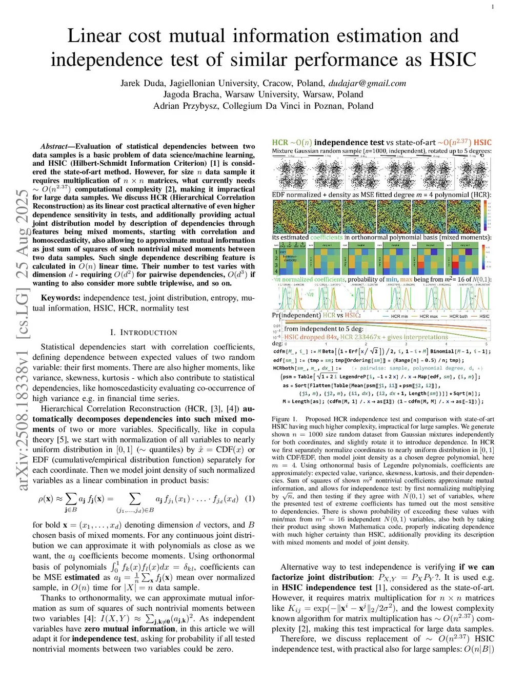 Evaluation of statistical dependencies between two data samples is a basic problem of data science/machine learning, and HSIC (Hilbert-Schmidt Information Criterion)~\cite{HSIC} is considered the state-of-art method. However, for size data sample it requires multiplication of matrices, what currently needs computational complexity~\cite{mult}, making it impractical for large data samples. We discuss HCR (Hierarchical Correlation Reconstruction) as its linear cost practical alternative, in tests of even higher sensitivity to dependencies, and additionally providing actual joint distribution model for chosen significance level, by description of dependencies through features being mixed moments, starting with correlation and homoscedasticity. Also allowing to approximate mutual information as just sum of squares of such nontrivial mixed moments between two data samples. Such single dependence describing feature is calculated in linear time. Their number to test varies with dimension - requiring for pairwise dependencies, if wanting to also consider more subtle triplewise, and so on.