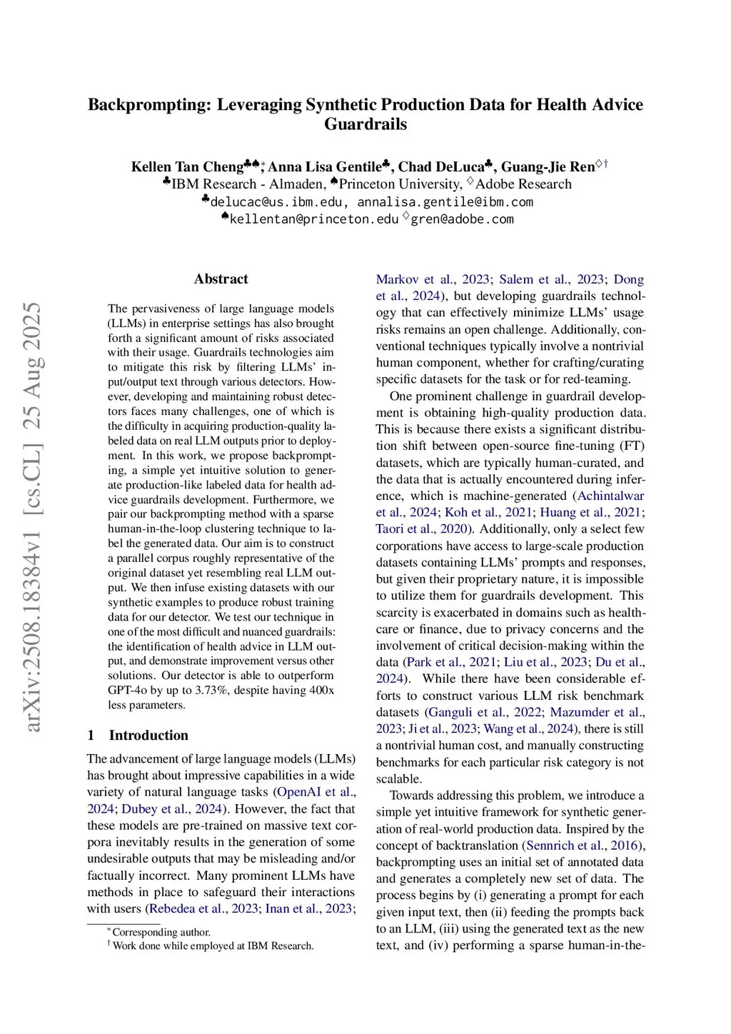 The pervasiveness of large language models (LLMs) in enterprise settings has also brought forth a significant amount of risks associated with their usage. Guardrails technologies aim to mitigate this risk by filtering LLMs' input/output text through various detectors. However, developing and maintaining robust detectors faces many challenges, one of which is the difficulty in acquiring production-quality labeled data on real LLM outputs prior to deployment. In this work, we propose backprompting, a simple yet intuitive solution to generate production-like labeled data for health advice guardrails development. Furthermore, we pair our backprompting method with a sparse human-in-the-loop clustering technique to label the generated data. Our aim is to construct a parallel corpus roughly representative of the original dataset yet resembling real LLM output. We then infuse existing datasets with our synthetic examples to produce robust training data for our detector. We test our technique in one of the most difficult and nuanced guardrails: the identification of health advice in LLM output, and demonstrate improvement versus other solutions. Our detector is able to outperform GPT-4o by up to 3.73%, despite having 400x less parameters.