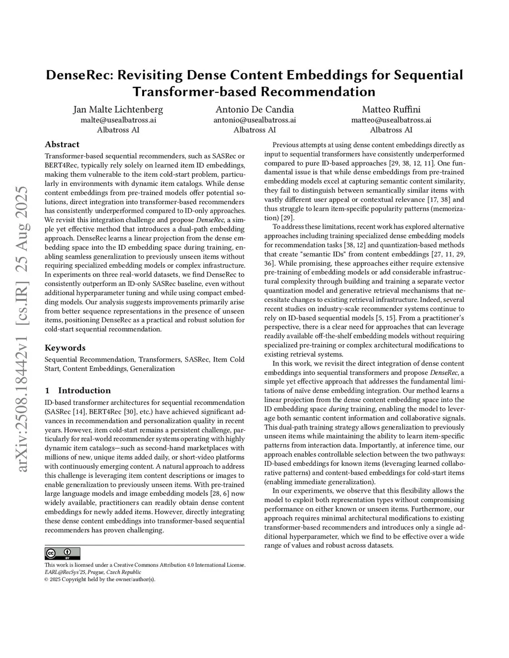 Transformer-based sequential recommenders, such as SASRec or BERT4Rec, typically rely solely on learned item ID embeddings, making them vulnerable to the item cold-start problem, particularly in environments with dynamic item catalogs. While dense content embeddings from pre-trained models offer potential solutions, direct integration into transformer-based recommenders has consistently underperformed compared to ID-only approaches. We revisit this integration challenge and propose DenseRec, a simple yet effective method that introduces a dual-path embedding approach. DenseRec learns a linear projection from the dense embedding space into the ID embedding space during training, enabling seamless generalization to previously unseen items without requiring specialized embedding models or complex infrastructure. In experiments on three real-world datasets, we find DenseRec to consistently outperform an ID-only SASRec baseline, even without additional hyperparameter tuning and while using compact embedding models. Our analysis suggests improvements primarily arise from better sequence representations in the presence of unseen items, positioning DenseRec as a practical and robust solution for cold-start sequential recommendation.