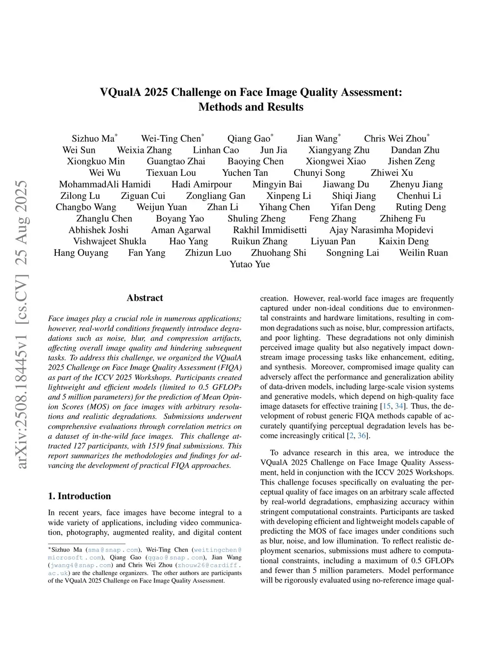 Face images play a crucial role in numerous applications; however, real-world conditions frequently introduce degradations such as noise, blur, and compression artifacts, affecting overall image quality and hindering subsequent tasks. To address this challenge, we organized the VQualA 2025 Challenge on Face Image Quality Assessment (FIQA) as part of the ICCV 2025 Workshops. Participants created lightweight and efficient models (limited to 0.5 GFLOPs and 5 million parameters) for the prediction of Mean Opinion Scores (MOS) on face images with arbitrary resolutions and realistic degradations. Submissions underwent comprehensive evaluations through correlation metrics on a dataset of in-the-wild face images. This challenge attracted 127 participants, with 1519 final submissions. This report summarizes the methodologies and findings for advancing the development of practical FIQA approaches.