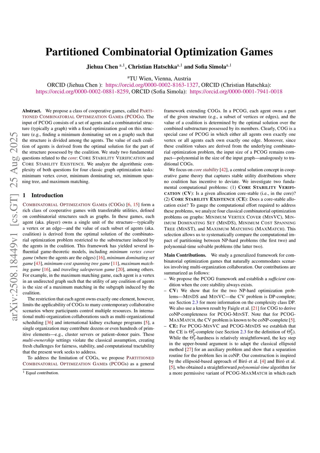 We propose a class of cooperative games, called d Partitioned Compbinatorial Optimization Games (PCOGs). The input of PCOG consists of a set of agents and a combinatorial structure (typically a graph) with a fixed optimization goal on this structure (e.g., finding a minimum dominating set on a graph) such that the structure is divided among the agents. The value of each coalition of agents is derived from the optimal solution for the part of the structure possessed by the coalition. We study two fundamental questions related to the core: Core Stability Verification and Core Stability Existence. We analyze the algorithmic complexity of both questions for four classic graph optimization tasks: minimum vertex cover, minimum dominating set, minimum spanning tree, and maximum matching.