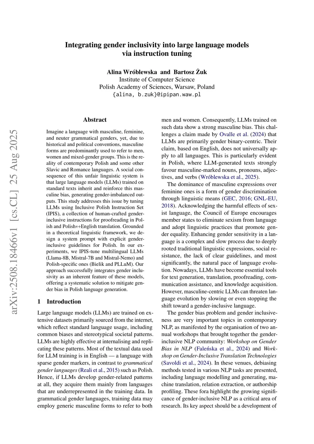 Imagine a language with masculine, feminine, and neuter grammatical genders, yet, due to historical and political conventions, masculine forms are predominantly used to refer to men, women and mixed-gender groups. This is the reality of contemporary Polish. A social consequence of this unfair linguistic system is that large language models (LLMs) trained on Polish texts inherit and reinforce this masculine bias, generating gender-imbalanced outputs. This study addresses this issue by tuning LLMs using the IPIS dataset, a collection of human-crafted gender-inclusive proofreading in Polish and Polish-to-English translation instructions. Grounded in a theoretical linguistic framework, we design a system prompt with explicit gender-inclusive guidelines for Polish. In our experiments, we IPIS-tune multilingual LLMs (Llama-8B, Mistral-7B and Mistral-Nemo) and Polish-specific LLMs (Bielik and PLLuM). Our approach aims to integrate gender inclusivity as an inherent feature of these models, offering a systematic solution to mitigate gender bias in Polish language generation.