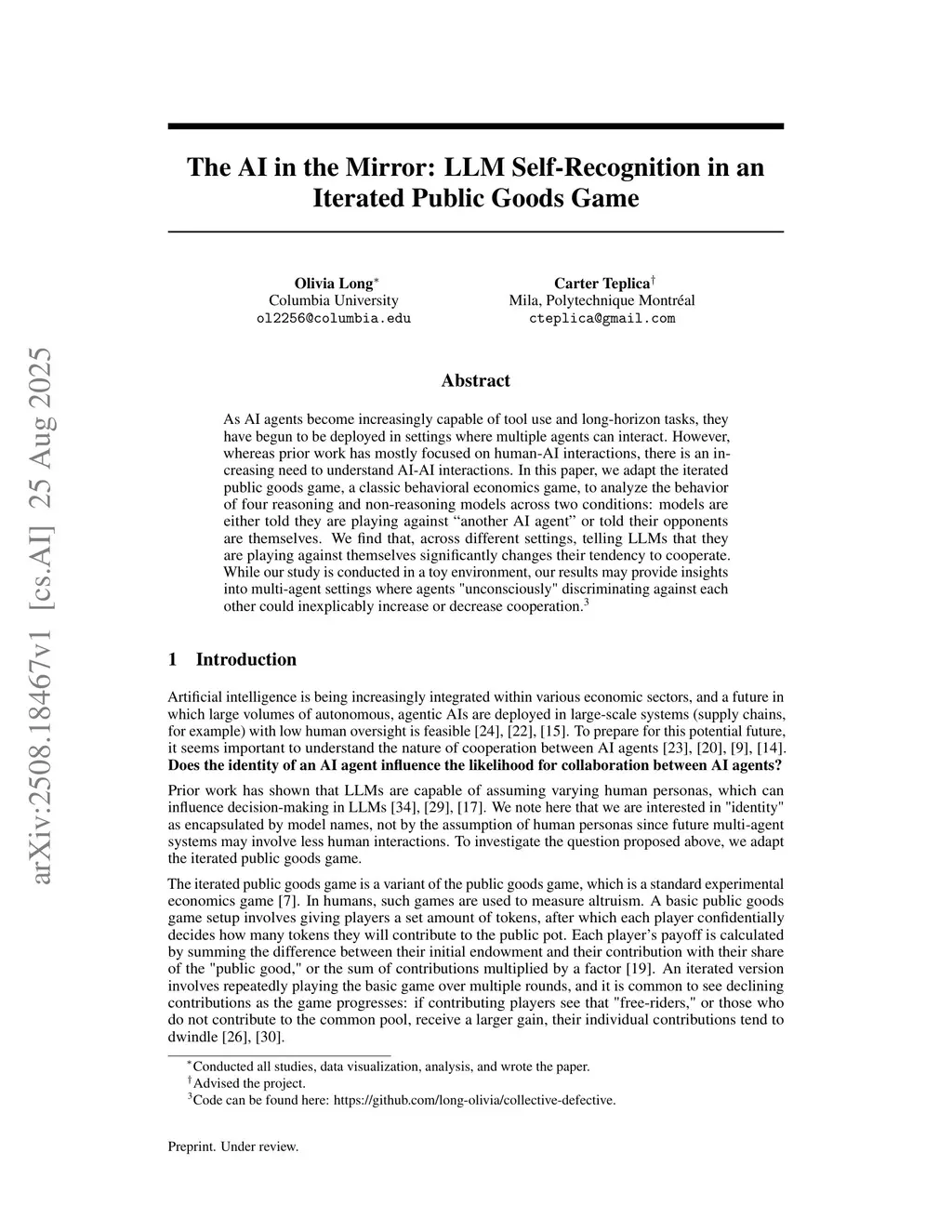 As AI agents become increasingly capable of tool use and long-horizon tasks, they have begun to be deployed in settings where multiple agents can interact. However, whereas prior work has mostly focused on human-AI interactions, there is an increasing need to understand AI-AI interactions. In this paper, we adapt the iterated public goods game, a classic behavioral economics game, to analyze the behavior of four reasoning and non-reasoning models across two conditions: models are either told they are playing against "another AI agent" or told their opponents are themselves. We find that, across different settings, telling LLMs that they are playing against themselves significantly changes their tendency to cooperate. While our study is conducted in a toy environment, our results may provide insights into multi-agent settings where agents "unconsciously" discriminating against each other could inexplicably increase or decrease cooperation.