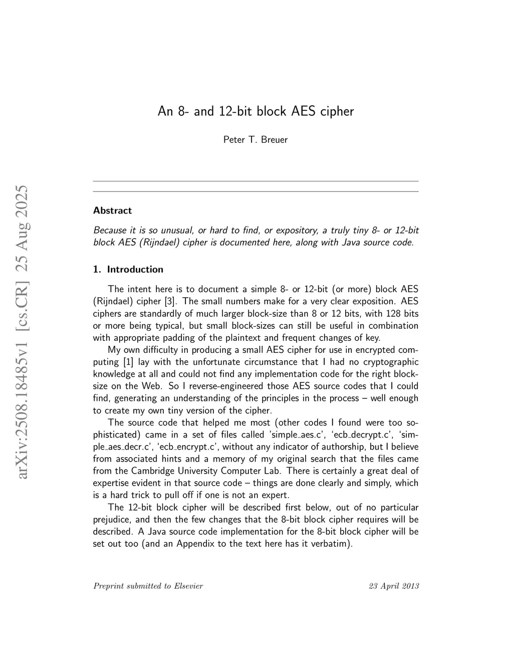 Because it is so unusual, or hard to find, or expository, a truly tiny 8- or 12-bit block AES (Rijndael) cipher is documented here, along with Java source code.