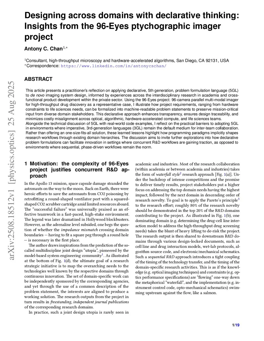 This article presents a practitioner's reflection on applying declarative, 5th generation, problem formulation language (5GL) to de novo imaging system design, informed by experiences across the interdisciplinary research in academia and cross-functional product development within the private sector. Using the 96-Eyes project: 96-camera parallel multi-modal imager for high-throughput drug discovery as a representative case, I illustrate how project requirements, ranging from hardware constraints to life sciences needs, can be formalized into machine-readable problem statements to preserve mission-critical input from diverse domain stakeholders. This declarative approach enhances transparency, ensures design traceability, and minimizes costly misalignment across optical, algorithmic, hardware-accelerated compute, and life sciences teams.Alongside the technical discussion of 5GL with real-world code examples, I reflect on the practical barriers to adopting 5GL in environments where imperative, 3rd-generation languages (3GL) remain the default medium for inter-team collaboration. Rather than offering an one-size-fits-all solution, these learned lessons highlight how programming paradigms implicitly shapes research workflows through existing domain hierarchies. The discussion aims to invite further explorations into how declarative problem formulations can facilitate innovation in settings where concurrent R\&{}D workflows are gaining traction, as opposed to environments where sequential, phase-driven workflows remain the norm.
