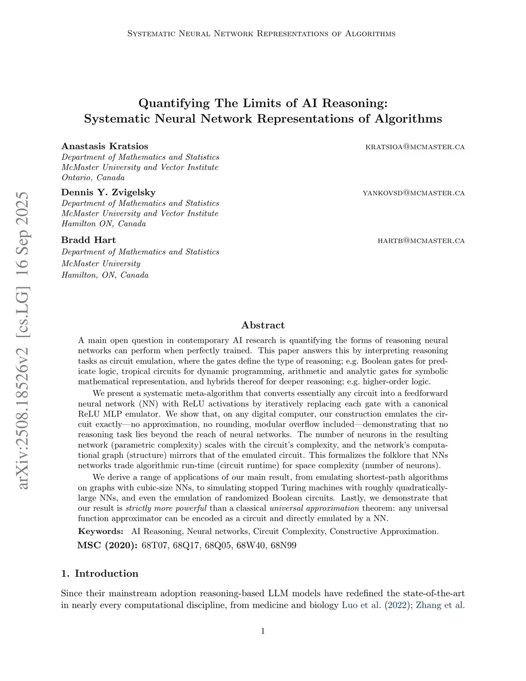 A main open question in contemporary AI research is quantifying the forms of reasoning neural networks can perform when perfectly trained. This paper answers this by interpreting reasoning tasks as circuit emulation, where the gates define the type of reasoning; e.g. Boolean gates for predicate logic, tropical circuits for dynamic programming, arithmetic and analytic gates for symbolic mathematical representation, and hybrids thereof for deeper reasoning; e.g. higher-order logic.We present a systematic meta-algorithm that converts essentially any circuit into a feedforward neural network (NN) with ReLU activations by iteratively replacing each gate with a canonical ReLU MLP emulator. We show that, on any digital computer, our construction emulates the circuit exactly--no approximation, no rounding, modular overflow included--demonstrating that no reasoning task lies beyond the reach of neural networks. The number of neurons in the resulting network (parametric complexity) scales with the circuit's complexity, and the network's computational graph (structure) mirrors that of the emulated circuit. This formalizes the folklore that NNs networks trade algorithmic run-time (circuit runtime) for space complexity (number of neurons).We derive a range of applications of our main result, from emulating shortest-path algorithms on graphs with cubic--size NNs, to simulating stopped Turing machines with roughly quadratically--large NNs, and even the emulation of randomized Boolean circuits. Lastly, we demonstrate that our result is strictly more powerful than a classical universal approximation theorem: any universal function approximator can be encoded as a circuit and directly emulated by a NN.