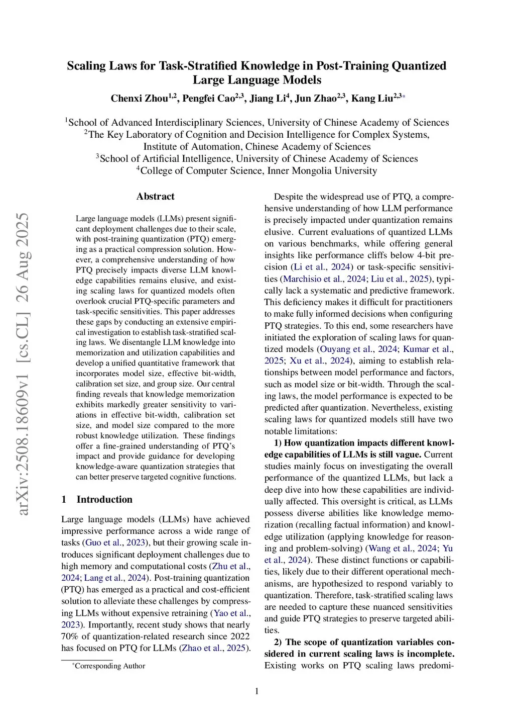 Post-Training Quantization (PTQ) is a critical strategy for efficient Large Language Models (LLMs) deployment. However, existing scaling laws primarily focus on general performance, overlooking crucial fine-grained factors and how quantization differentially impacts diverse knowledge capabilities. To address this, we establish Task-Stratified Knowledge Scaling Laws. By stratifying capabilities into memorization, application, and reasoning, we develop a framework that unifies model size, bit-width, and fine-grained factors: group size and calibration set size. Validated on 293 diverse PTQ configurations, our framework demonstrates strong fit and cross-architecture consistency. It reveals distinct sensitivities across knowledge capabilities: reasoning is precision-critical, application is scale-responsive, and memorization is calibration-sensitive. We highlight that in low-bit scenarios, optimizing these fine-grained factors is essential for preventing performance collapse. These findings provide an empirically-backed foundation for designing knowledge-aware quantization strategies.