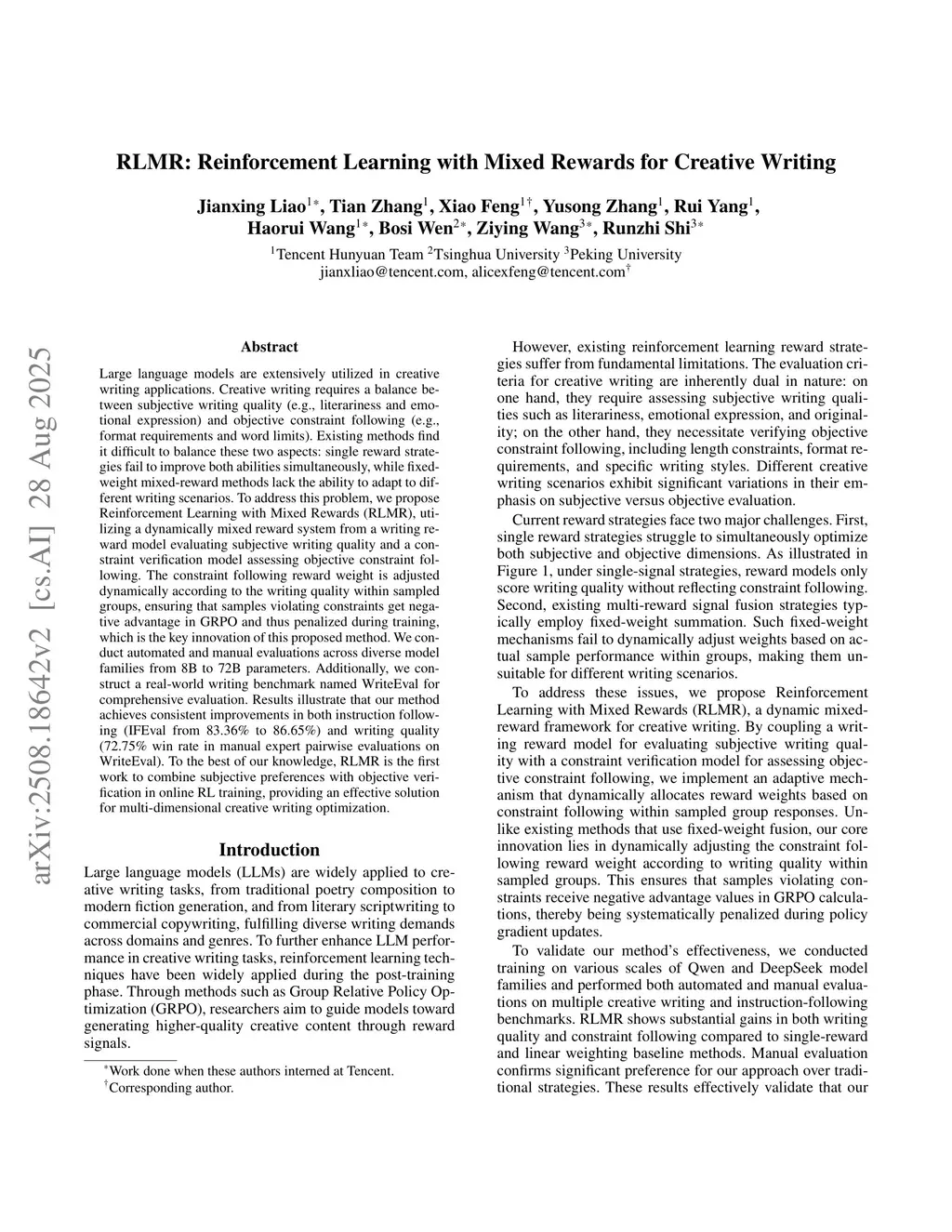 RLMR: Reinforcement Learning with Mixed Rewards for Creative Writing