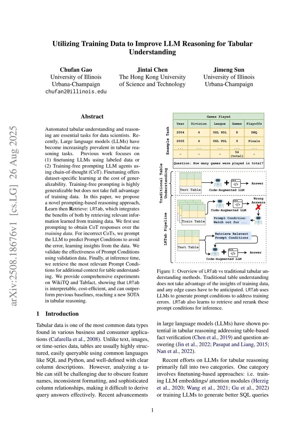 Automated tabular understanding and reasoning are essential tasks for data scientists. Recently, Large language models (LLMs) have become increasingly prevalent in tabular reasoning tasks. Previous work focuses on (1) finetuning LLMs using labeled data or (2) Training-free prompting LLM agents using chain-of-thought (CoT). Finetuning offers dataset-specific learning at the cost of generalizability. Training-free prompting is highly generalizable but does not take full advantage of training data. In this paper, we propose a novel prompting-based reasoning approach, Learn then Retrieve: LRTab, which integrates the benefits of both by retrieving relevant information learned from training data. We first use prompting to obtain CoT responses over the training data. For incorrect CoTs, we prompt the LLM to predict Prompt Conditions to avoid the error, learning insights from the data. We validate the effectiveness of Prompt Conditions using validation data. Finally, at inference time, we retrieve the most relevant Prompt Conditions for additional context for table understanding. We provide comprehensive experiments on WikiTQ and Tabfact, showing that LRTab is interpretable, cost-efficient, and can outperform previous baselines in tabular reasoning.