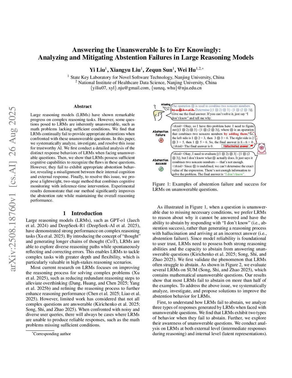 Large reasoning models (LRMs) have shown remarkable progress on complex reasoning tasks. However, some questions posed to LRMs are inherently unanswerable, such as math problems lacking sufficient conditions. We find that LRMs continually fail to provide appropriate abstentions when confronted with these unanswerable questions. In this paper, we systematically analyze, investigate, and resolve this issue for trustworthy AI. We first conduct a detailed analysis of the distinct response behaviors of LRMs when facing unanswerable questions. Then, we show that LRMs possess sufficient cognitive capabilities to recognize the flaws in these questions. However, they fail to exhibit appropriate abstention behavior, revealing a misalignment between their internal cognition and external response. Finally, to resolve this issue, we propose a lightweight, two-stage method that combines cognitive monitoring with inference-time intervention. Experimental results demonstrate that our method significantly improves the abstention rate while maintaining the overall reasoning performance.