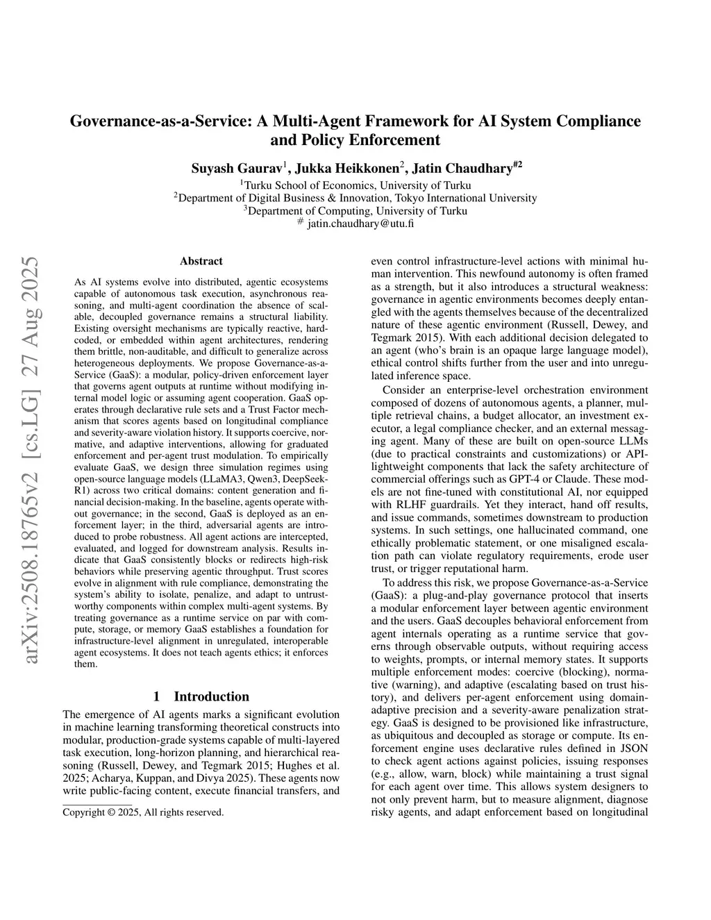 As AI systems evolve into distributed ecosystems with autonomous execution, asynchronous reasoning, and multi-agent coordination, the absence of scalable, decoupled governance poses a structural risk. Existing oversight mechanisms are reactive, brittle, and embedded within agent architectures, making them non-auditable and hard to generalize across heterogeneous deployments.We introduce Governance-as-a-Service (GaaS): a modular, policy-driven enforcement layer that regulates agent outputs at runtime without altering model internals or requiring agent cooperation. GaaS employs declarative rules and a Trust Factor mechanism that scores agents based on compliance and severity-weighted violations. It enables coercive, normative, and adaptive interventions, supporting graduated enforcement and dynamic trust modulation.To evaluate GaaS, we conduct three simulation regimes with open-source models (LLaMA3, Qwen3, DeepSeek-R1) across content generation and financial decision-making. In the baseline, agents act without governance; in the second, GaaS enforces policies; in the third, adversarial agents probe robustness. All actions are intercepted, evaluated, and logged for analysis. Results show that GaaS reliably blocks or redirects high-risk behaviors while preserving throughput. Trust scores track rule adherence, isolating and penalizing untrustworthy components in multi-agent systems.By positioning governance as a runtime service akin to compute or storage, GaaS establishes infrastructure-level alignment for interoperable agent ecosystems. It does not teach agents ethics; it enforces them.