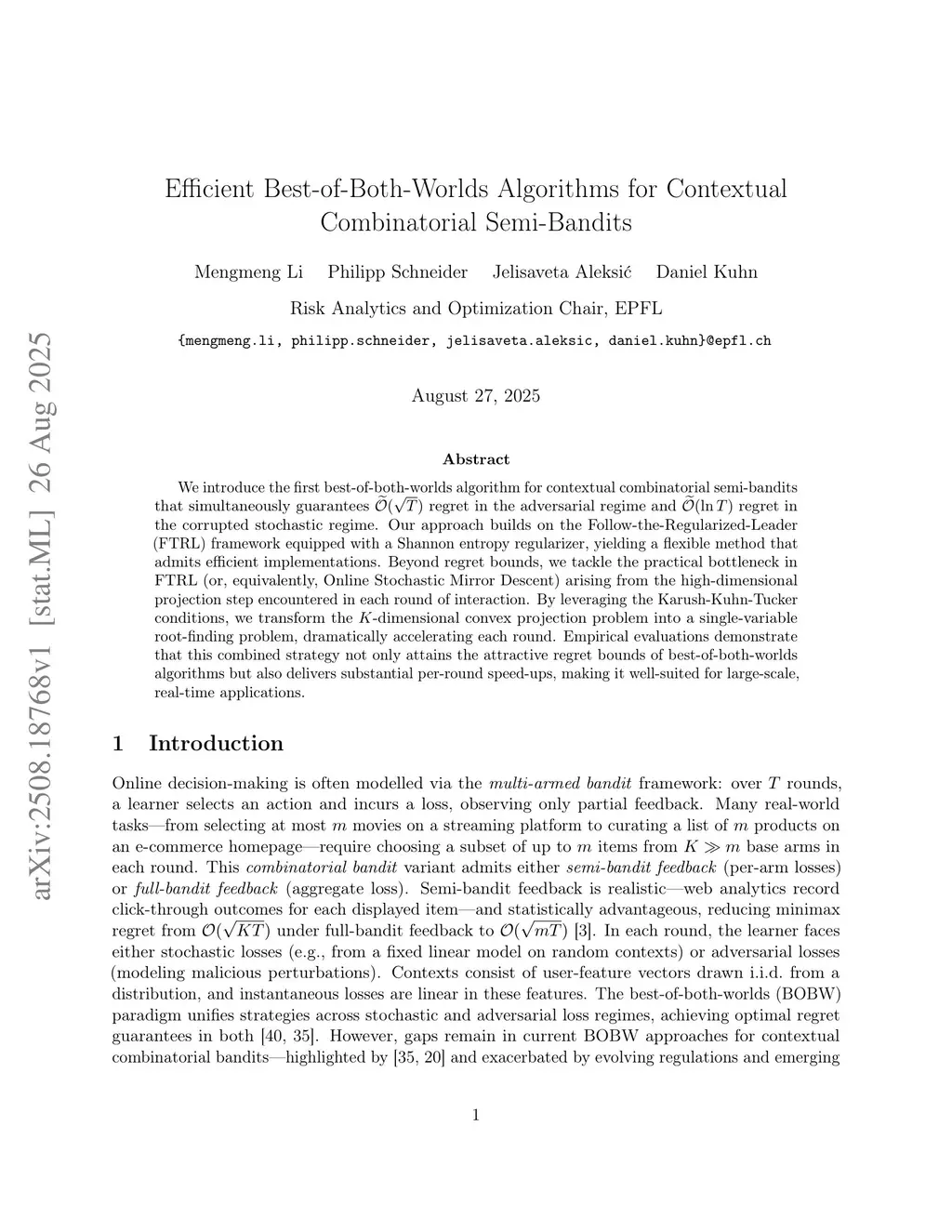 We introduce the first best-of-both-worlds algorithm for contextual combinatorial semi-bandits that simultaneously guarantees regret in the adversarial regime and regret in the corrupted stochastic regime. Our approach builds on the Follow-the-Regularized-Leader (FTRL) framework equipped with a Shannon entropy regularizer, yielding a flexible method that admits efficient implementations. Beyond regret bounds, we tackle the practical bottleneck in FTRL (or, equivalently, Online Stochastic Mirror Descent) arising from the high-dimensional projection step encountered in each round of interaction. By leveraging the Karush-Kuhn-Tucker conditions, we transform the -dimensional convex projection problem into a single-variable root-finding problem, dramatically accelerating each round. Empirical evaluations demonstrate that this combined strategy not only attains the attractive regret bounds of best-of-both-worlds algorithms but also delivers substantial per-round speed-ups, making it well-suited for large-scale, real-time applications.