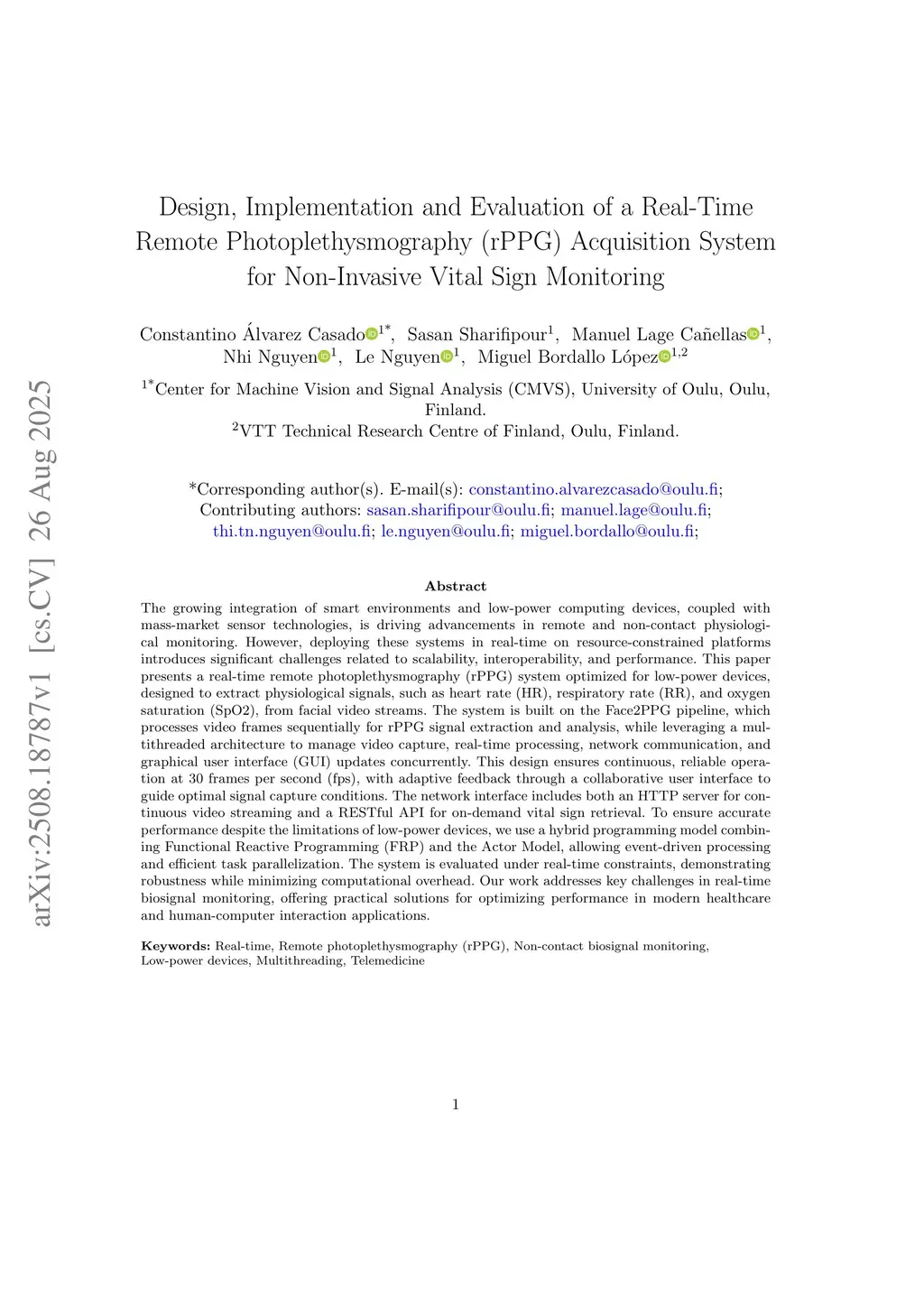 The growing integration of smart environments and low-power computing devices, coupled with mass-market sensor technologies, is driving advancements in remote and non-contact physiological monitoring. However, deploying these systems in real-time on resource-constrained platforms introduces significant challenges related to scalability, interoperability, and performance. This paper presents a real-time remote photoplethysmography (rPPG) system optimized for low-power devices, designed to extract physiological signals, such as heart rate (HR), respiratory rate (RR), and oxygen saturation (SpO2), from facial video streams. The system is built on the Face2PPG pipeline, which processes video frames sequentially for rPPG signal extraction and analysis, while leveraging a multithreaded architecture to manage video capture, real-time processing, network communication, and graphical user interface (GUI) updates concurrently. This design ensures continuous, reliable operation at 30 frames per second (fps), with adaptive feedback through a collaborative user interface to guide optimal signal capture conditions. The network interface includes both an HTTP server for continuous video streaming and a RESTful API for on-demand vital sign retrieval. To ensure accurate performance despite the limitations of low-power devices, we use a hybrid programming model combining Functional Reactive Programming (FRP) and the Actor Model, allowing event-driven processing and efficient task parallelization. The system is evaluated under real-time constraints, demonstrating robustness while minimizing computational overhead. Our work addresses key challenges in real-time biosignal monitoring, offering practical solutions for optimizing performance in modern healthcare and human-computer interaction applications.