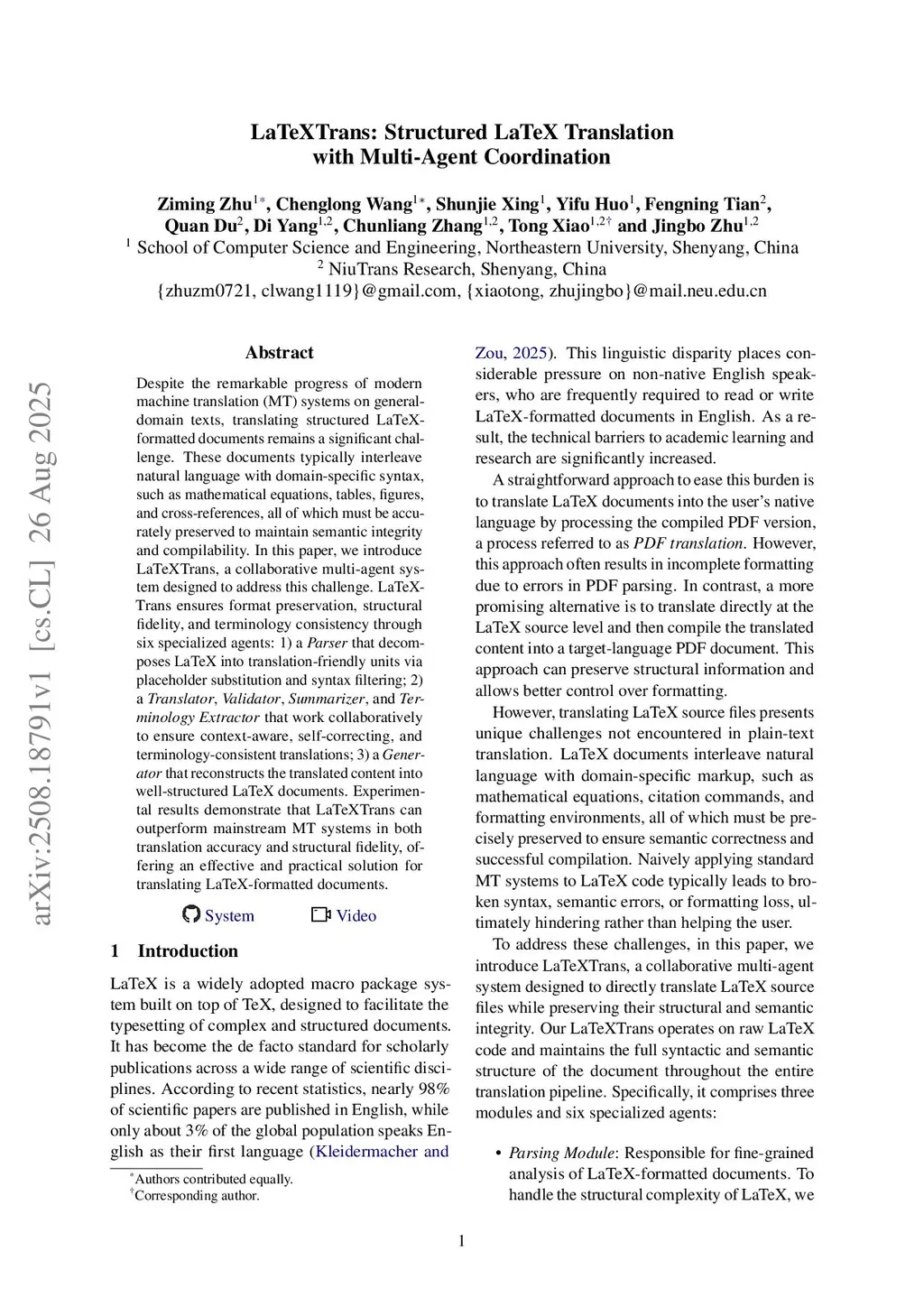 Despite the remarkable progress of modern machine translation (MT) systems on general-domain texts, translating structured LaTeX-formatted documents remains a significant challenge. These documents typically interleave natural language with domain-specific syntax, such as mathematical equations, tables, figures, and cross-references, all of which must be accurately preserved to maintain semantic integrity and compilability. In this paper, we introduce LaTeXTrans, a collaborative multi-agent system designed to address this challenge. LaTeXTrans ensures format preservation, structural fidelity, and terminology consistency through six specialized agents: 1) a Parser that decomposes LaTeX into translation-friendly units via placeholder substitution and syntax filtering; 2) a Translator, Validator, Summarizer, and Terminology Extractor that work collaboratively to ensure context-aware, self-correcting, and terminology-consistent translations; 3) a Generator that reconstructs the translated content into well-structured LaTeX documents. Experimental results show that LaTeXTrans outperforms mainstream MT systems in both translation accuracy and structural preservation. The source code, the online demonstration platform, and a demo video are publicly available.