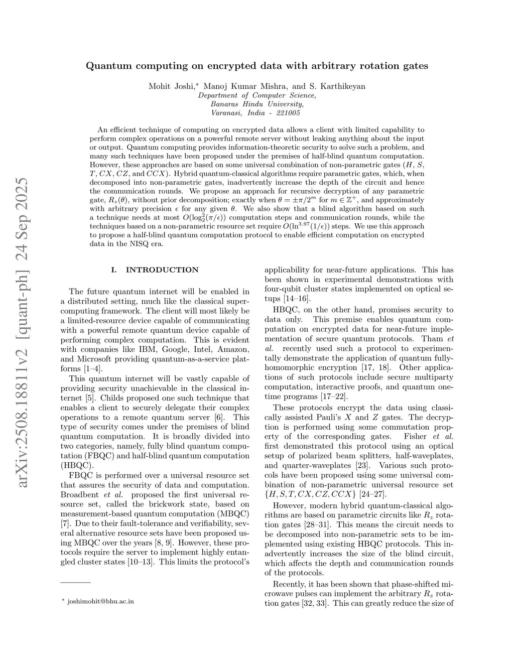 An efficient technique of computing on encrypted data allows a client with limited capability to perform complex operations on a remote fault-tolerant server without leaking anything about the input or output. Quantum computing provides information-theoretic security to solve such a problem, and many such techniques have been proposed under the premises of half-blind quantum computation. However, they are dependent on a fixed non-parametric resource set that comprises some universal combination of or gates. In this study, we show that recursive decryption of the parametric gate, , is possible exactly when for , and approximately with arbitrary precision for given . We also show that a blind algorithm based on such a technique needs at most computation steps and communication rounds, while the techniques based on a non-parametric resource set require rounds. We use these results to propose a universal scheme of half-blind quantum computation for computing on encrypted data using arbitrary rotation gates. This substantial reduction in the depth of blind circuit is an affirmative step towards the practical application of such techniques in secure NISQ-era computing.