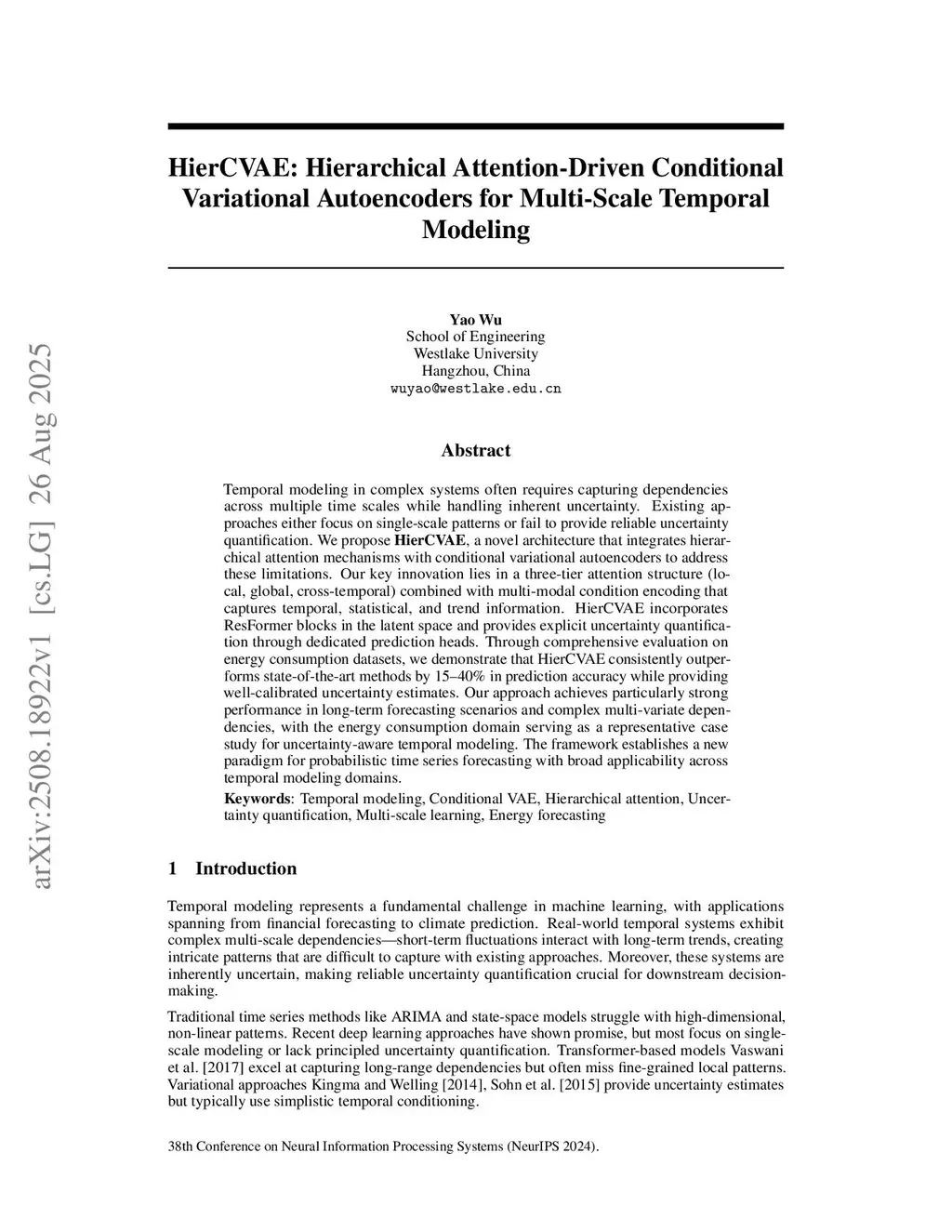 Temporal modeling in complex systems requires capturing dependencies across multiple time scales while managing inherent uncertainties. We propose HierCVAE, a novel architecture that integrates hierarchical attention mechanisms with conditional variational autoencoders to address these challenges. HierCVAE employs a three-tier attention structure (local, global, cross-temporal) combined with multi-modal condition encoding to capture temporal, statistical, and trend information. The approach incorporates ResFormer blocks in the latent space and provides explicit uncertainty quantification via prediction heads. Through evaluations on energy consumption datasets, HierCVAE demonstrates a 15-40% improvement in prediction accuracy and superior uncertainty calibration compared to state-of-the-art methods, excelling in long-term forecasting and complex multi-variate dependencies.