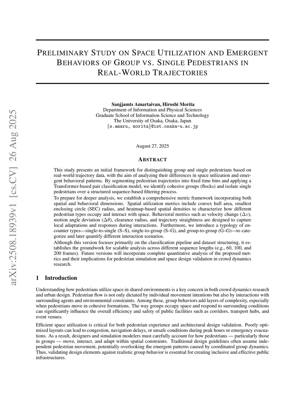 This study presents an initial framework for distinguishing group and single pedestrians based on real-world trajectory data, with the aim of analyzing their differences in space utilization and emergent behavioral patterns. By segmenting pedestrian trajectories into fixed time bins and applying a Transformer-based pair classification model, we identify cohesive groups and isolate single pedestrians over a structured sequence-based filtering process. To prepare for deeper analysis, we establish a comprehensive metric framework incorporating both spatial and behavioral dimensions. Spatial utilization metrics include convex hull area, smallest enclosing circle radius, and heatmap-based spatial densities to characterize how different pedestrian types occupy and interact with space. Behavioral metrics such as velocity change, motion angle deviation, clearance radius, and trajectory straightness are designed to capture local adaptations and responses during interactions. Furthermore, we introduce a typology of encounter types-single-to-single, single-to-group, and group-to-group to categorize and later quantify different interaction scenarios. Although this version focuses primarily on the classification pipeline and dataset structuring, it establishes the groundwork for scalable analysis across different sequence lengths 60, 100, and 200 frames. Future versions will incorporate complete quantitative analysis of the proposed metrics and their implications for pedestrian simulation and space design validation in crowd dynamics research.