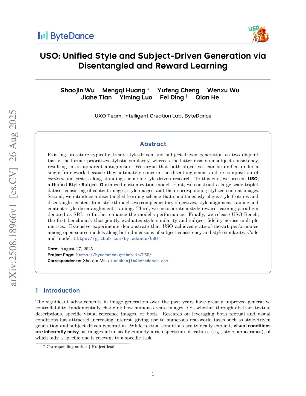USO: Unified Style and Subject-Driven Generation via Disentangled and Reward Learning