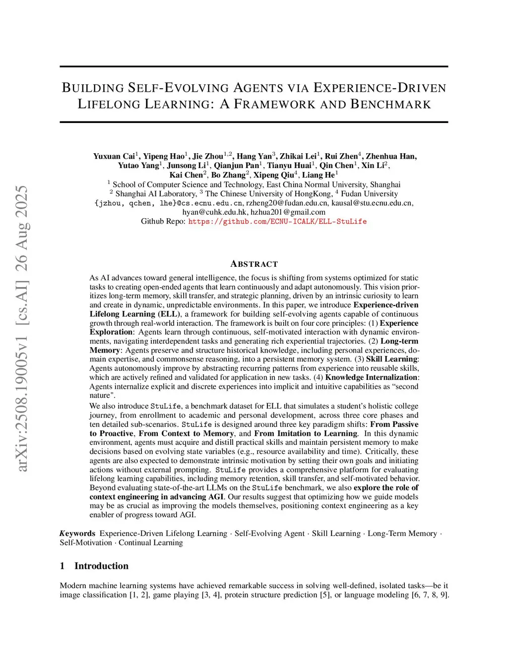 As AI advances toward general intelligence, the focus is shifting from systems optimized for static tasks to creating open-ended agents that learn continuously. In this paper, we introduce Experience-driven Lifelong Learning (ELL), a framework for building self-evolving agents capable of continuous growth through real-world interaction. The framework is built on four core principles: (1) Experience Exploration: Agents learn through continuous, self-motivated interaction with dynamic environments, navigating interdependent tasks and generating rich experiential trajectories. (2) Long-term Memory: Agents preserve and structure historical knowledge, including personal experiences, domain expertise, and commonsense reasoning, into a persistent memory system. (3) Skill Learning: Agents autonomously improve by abstracting recurring patterns from experience into reusable skills, which are actively refined and validated for application in new tasks. (4) Knowledge Internalization: Agents internalize explicit and discrete experiences into implicit and intuitive capabilities as "second nature".We also introduce StuLife, a benchmark dataset for ELL that simulates a student's holistic college journey, from enrollment to academic and personal development, across three core phases and ten detailed sub-scenarios. StuLife is designed around three key paradigm