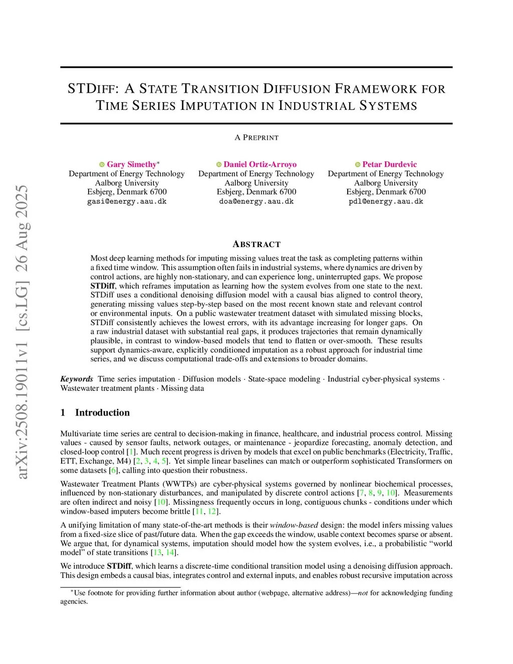 Most deep learning methods for imputing missing values treat the task as completing patterns within a fixed time window. This assumption often fails in industrial systems, where dynamics are driven by control actions, are highly non-stationary, and can experience long, uninterrupted gaps. We propose STDiff, which reframes imputation as learning how the system evolves from one state to the next. STDiff uses a conditional denoising diffusion model with a causal bias aligned to control theory, generating missing values step-by-step based on the most recent known state and relevant control or environmental inputs. On a public wastewater treatment dataset with simulated missing blocks, STDiff consistently achieves the lowest errors, with its advantage increasing for longer gaps. On a raw industrial dataset with substantial real gaps, it produces trajectories that remain dynamically plausible, in contrast to window-based models that tend to flatten or over-smooth. These results support dynamics-aware, explicitly conditioned imputation as a robust approach for industrial time series, and we discuss computational trade-offs and extensions to broader domains.