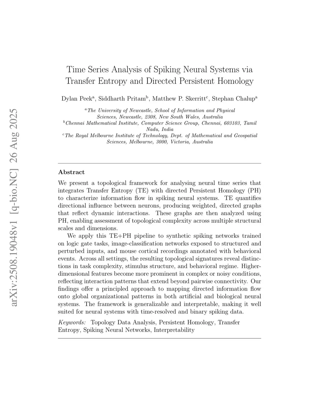 We present a topological framework for analysing neural time series that integrates Transfer Entropy (TE) with directed Persistent Homology (PH) to characterize information flow in spiking neural systems. TE quantifies directional influence between neurons, producing weighted, directed graphs that reflect dynamic interactions. These graphs are then analyzed using PH, enabling assessment of topological complexity across multiple structural scales and dimensions.We apply this TE+PH pipeline to synthetic spiking networks trained on logic gate tasks, image-classification networks exposed to structured and perturbed inputs, and mouse cortical recordings annotated with behavioral events. Across all settings, the resulting topological signatures reveal distinctions in task complexity, stimulus structure, and behavioral regime. Higher-dimensional features become more prominent in complex or noisy conditions, reflecting interaction patterns that extend beyond pairwise connectivity. Our findings offer a principled approach to mapping directed information flow onto global organizational patterns in both artificial and biological neural systems. The framework is generalizable and interpretable, making it well suited for neural systems with time-resolved and binary spiking data.