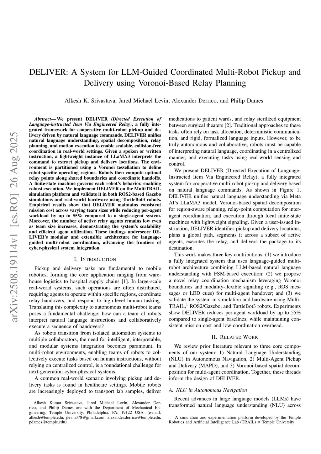 We present DELIVER (Directed Execution of Language-instructed Item Via Engineered Relay), a fully integrated framework for cooperative multi-robot pickup and delivery driven by natural language commands. DELIVER unifies natural language understanding, spatial decomposition, relay planning, and motion execution to enable scalable, collision-free coordination in real-world settings. Given a spoken or written instruction, a lightweight instance of LLaMA3 interprets the command to extract pickup and delivery locations. The environment is partitioned using a Voronoi tessellation to define robot-specific operating regions. Robots then compute optimal relay points along shared boundaries and coordinate handoffs. A finite-state machine governs each robot's behavior, enabling robust execution. We implement DELIVER on the MultiTRAIL simulation platform and validate it in both ROS2-based Gazebo simulations and real-world hardware using TurtleBot3 robots. Empirical results show that DELIVER maintains consistent mission cost across varying team sizes while reducing per-agent workload by up to 55% compared to a single-agent system. Moreover, the number of active relay agents remains low even as team size increases, demonstrating the system's scalability and efficient agent utilization. These findings underscore DELIVER's modular and extensible architecture for language-guided multi-robot coordination, advancing the frontiers of cyber-physical system integration.