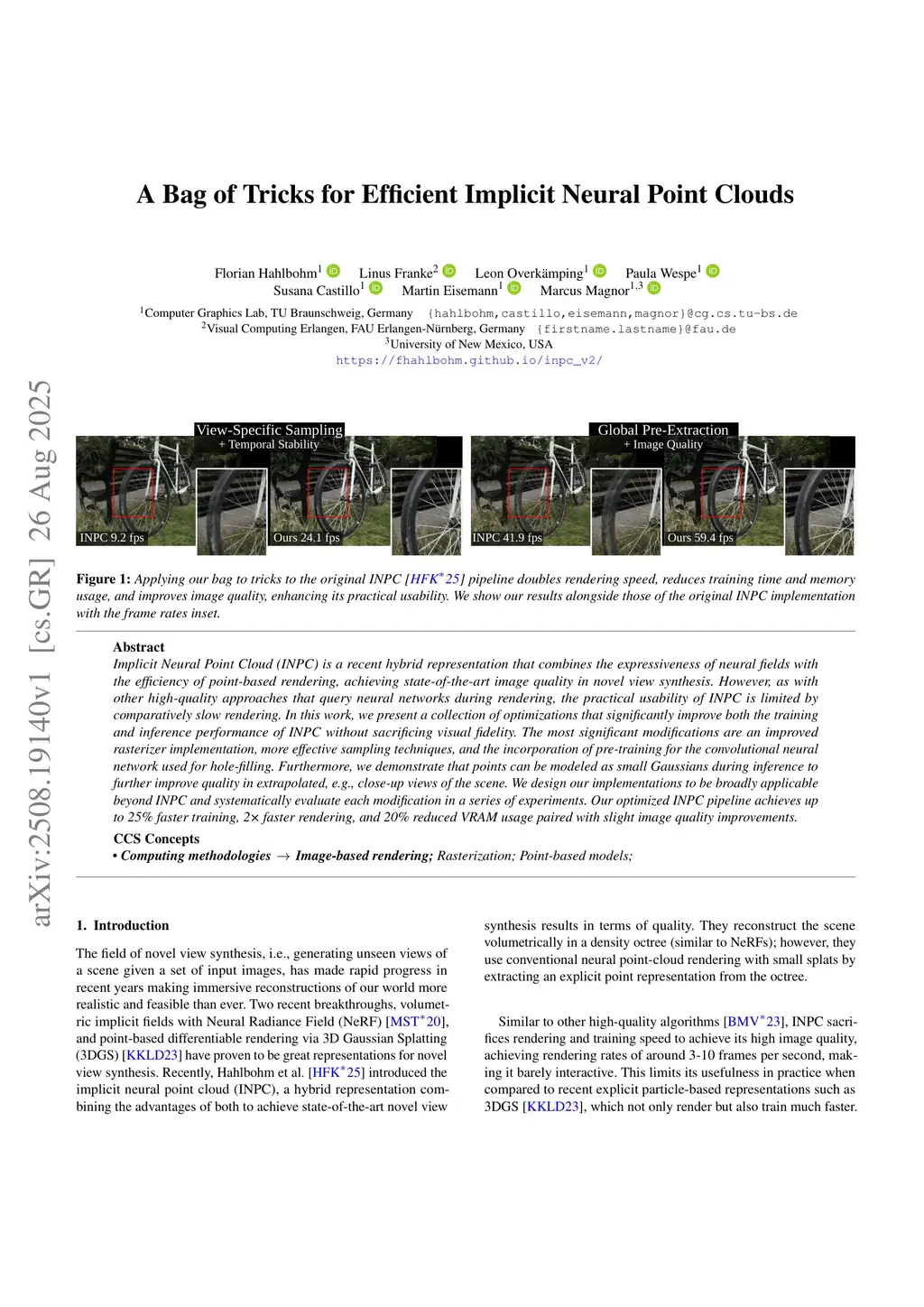 Implicit Neural Point Cloud (INPC) is a recent hybrid representation that combines the expressiveness of neural fields with the efficiency of point-based rendering, achieving state-of-the-art image quality in novel view synthesis. However, as with other high-quality approaches that query neural networks during rendering, the practical usability of INPC is limited by comparatively slow rendering. In this work, we present a collection of optimizations that significantly improve both the training and inference performance of INPC without sacrificing visual fidelity. The most significant modifications are an improved rasterizer implementation, more effective sampling techniques, and the incorporation of pre-training for the convolutional neural network used for hole-filling. Furthermore, we demonstrate that points can be modeled as small Gaussians during inference to further improve quality in extrapolated, e.g., close-up views of the scene. We design our implementations to be broadly applicable beyond INPC and systematically evaluate each modification in a series of experiments. Our optimized INPC pipeline achieves up to 25% faster training, 2x faster rendering, and 20% reduced VRAM usage paired with slight image quality improvements.