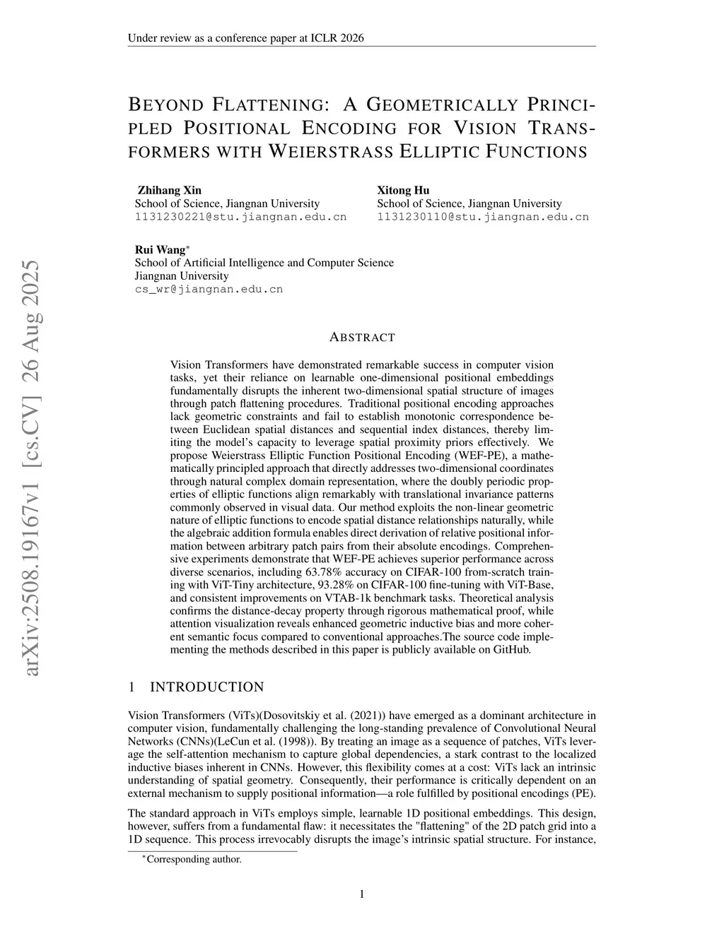 Vision Transformers have demonstrated remarkable success in computer vision tasks, yet their reliance on learnable one-dimensional positional embeddings fundamentally disrupts the inherent two-dimensional spatial structure of images through patch flattening procedures. Traditional positional encoding approaches lack geometric constraints and fail to establish monotonic correspondence between Euclidean spatial distances and sequential index distances, thereby limiting the model's capacity to leverage spatial proximity priors effectively. We propose Weierstrass Elliptic Function Positional Encoding (WEF-PE), a mathematically principled approach that directly addresses two-dimensional coordinates through natural complex domain representation, where the doubly periodic properties of elliptic functions align remarkably with translational invariance patterns commonly observed in visual data. Our method exploits the non-linear geometric nature of elliptic functions to encode spatial distance relationships naturally, while the algebraic addition formula enables direct derivation of relative positional information between arbitrary patch pairs from their absolute encodings. Comprehensive experiments demonstrate that WEF-PE achieves superior performance across diverse scenarios, including 63.78\% accuracy on CIFAR-100 from-scratch training with ViT-Tiny architecture, 93.28\% on CIFAR-100 fine-tuning with ViT-Base, and consistent improvements on VTAB-1k benchmark tasks. Theoretical analysis confirms the distance-decay property through rigorous mathematical proof, while attention visualization reveals enhanced geometric inductive bias and more coherent semantic focus compared to conventionalthis http URLsource code implementing the methods described in this paper is publicly available on GitHub.