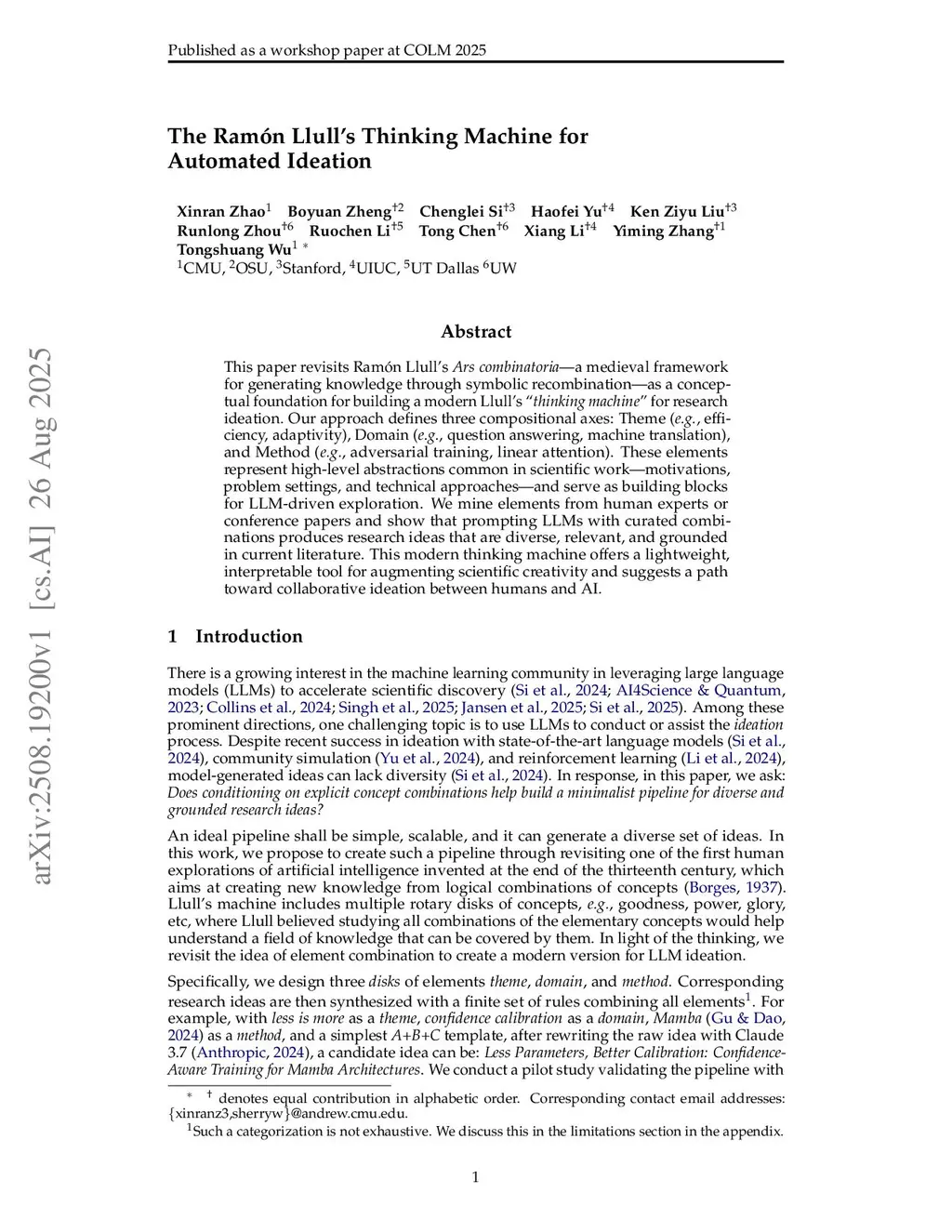This paper revisits Ramon Llull's Ars combinatoria - a medieval framework for generating knowledge through symbolic recombination - as a conceptual foundation for building a modern Llull's thinking machine for research ideation. Our approach defines three compositional axes: Theme (e.g., efficiency, adaptivity), Domain (e.g., question answering, machine translation), and Method (e.g., adversarial training, linear attention). These elements represent high-level abstractions common in scientific work - motivations, problem settings, and technical approaches - and serve as building blocks for LLM-driven exploration. We mine elements from human experts or conference papers and show that prompting LLMs with curated combinations produces research ideas that are diverse, relevant, and grounded in current literature. This modern thinking machine offers a lightweight, interpretable tool for augmenting scientific creativity and suggests a path toward collaborative ideation between humans and AI.